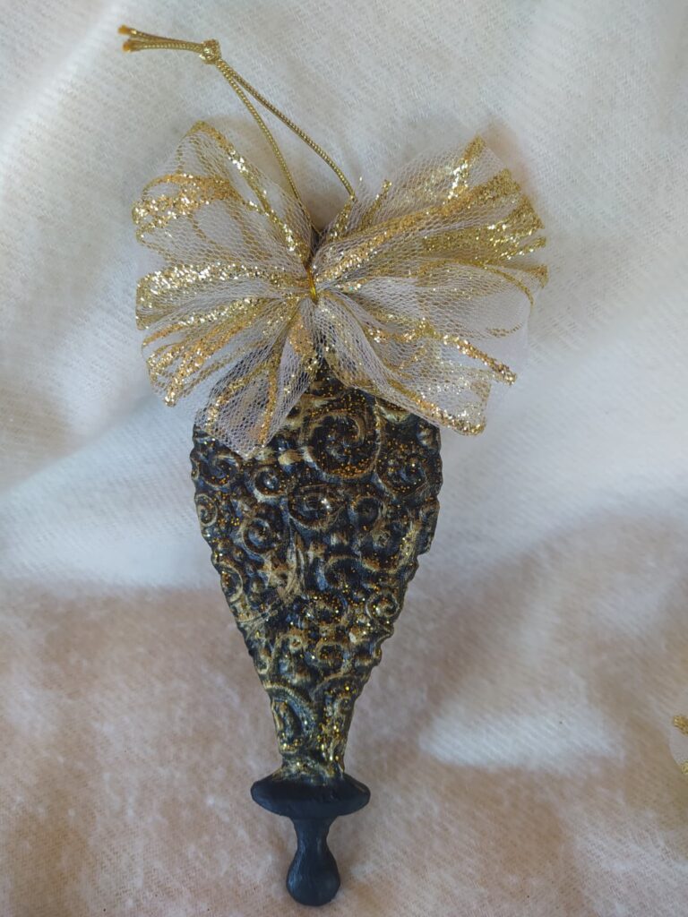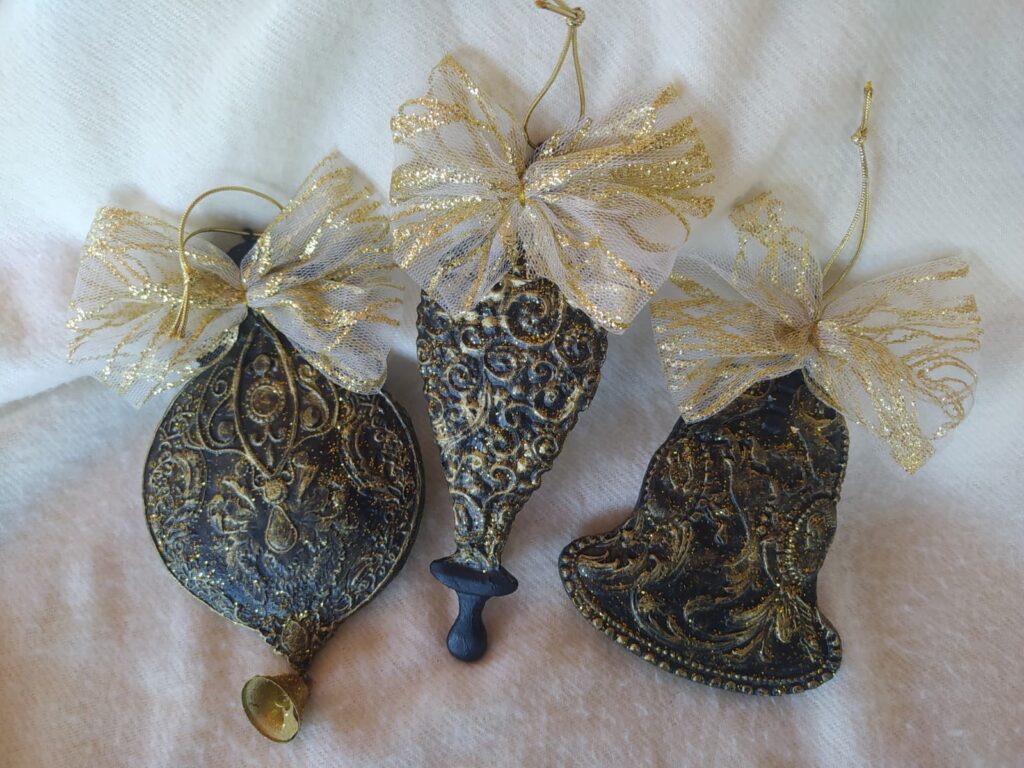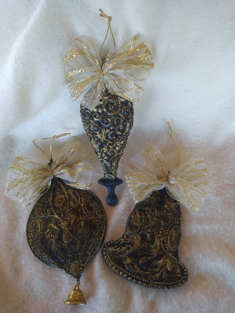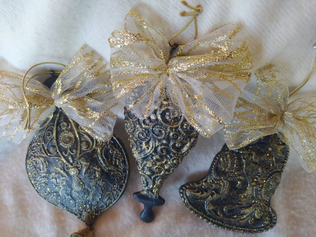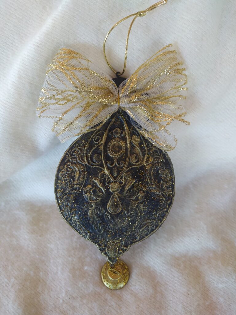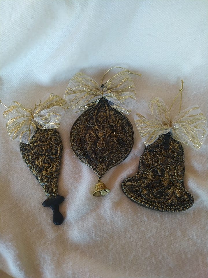 Elaborados con pasta de modelado en frío utilizando molde. Cada pieza está cuidadosamente decorada a mano con pintura acrílica, detalles de purpurina dorada y lazos navideños, creando unos adornos únicos y llenos de encanto para tus celebraciones.