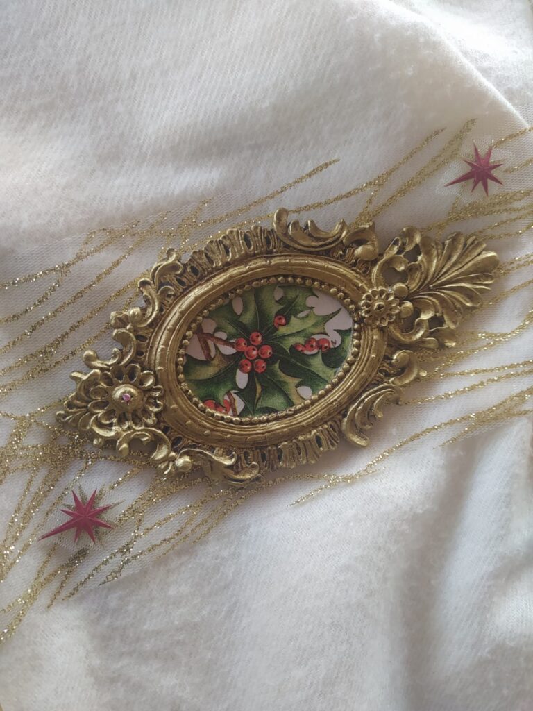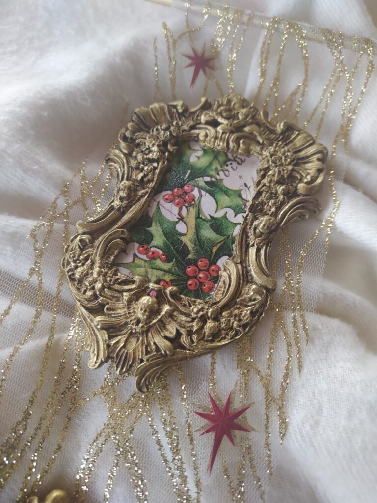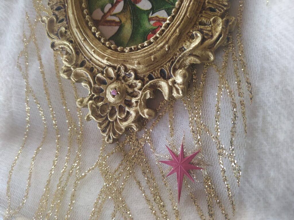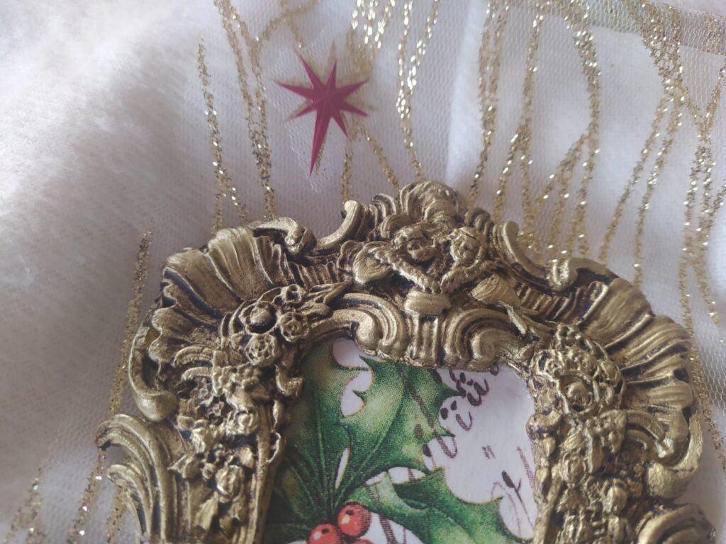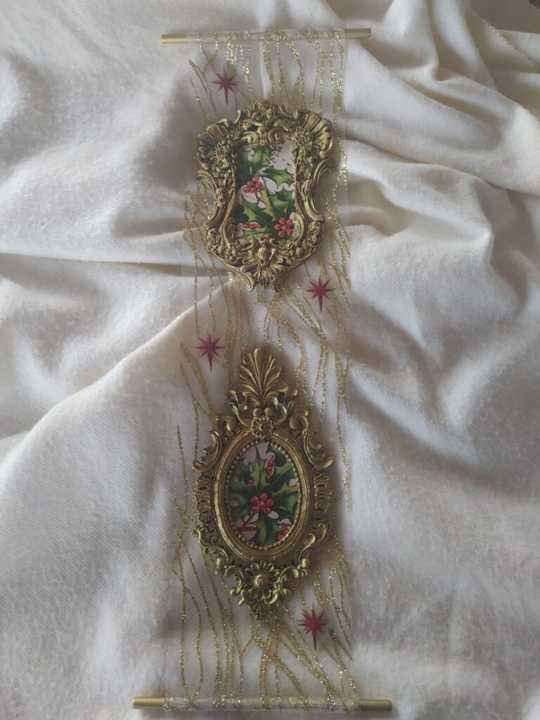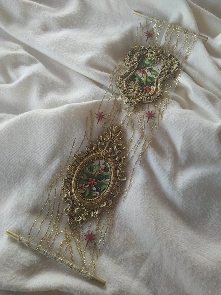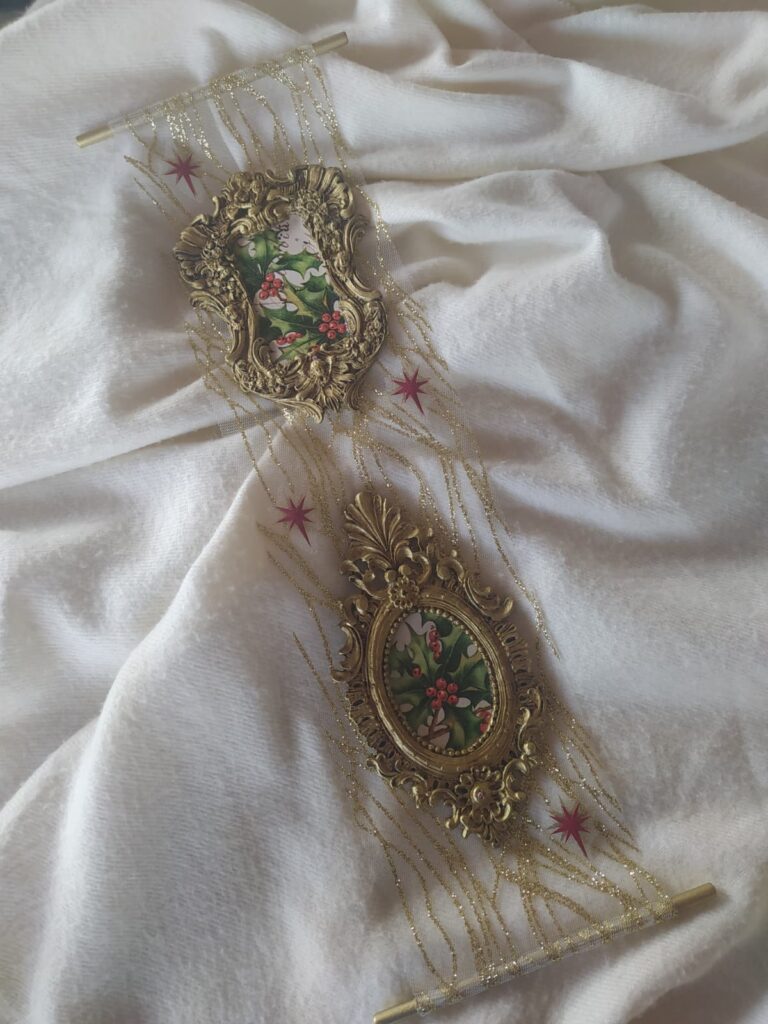 Conjunto de dos marcos elaborados artesanalmente con pasta de modelado en frío, realizados en molde y decorados con pintura acrílica en tono dorado. Incluyen detalles en lámina de decoupage con delicados motivos navideños. Ambos marcos están montados sobre una cinta navideña decorativa y rematados en los extremos con palos pintados en dorado, lo que permite colgar el conjunto de manera elegante.