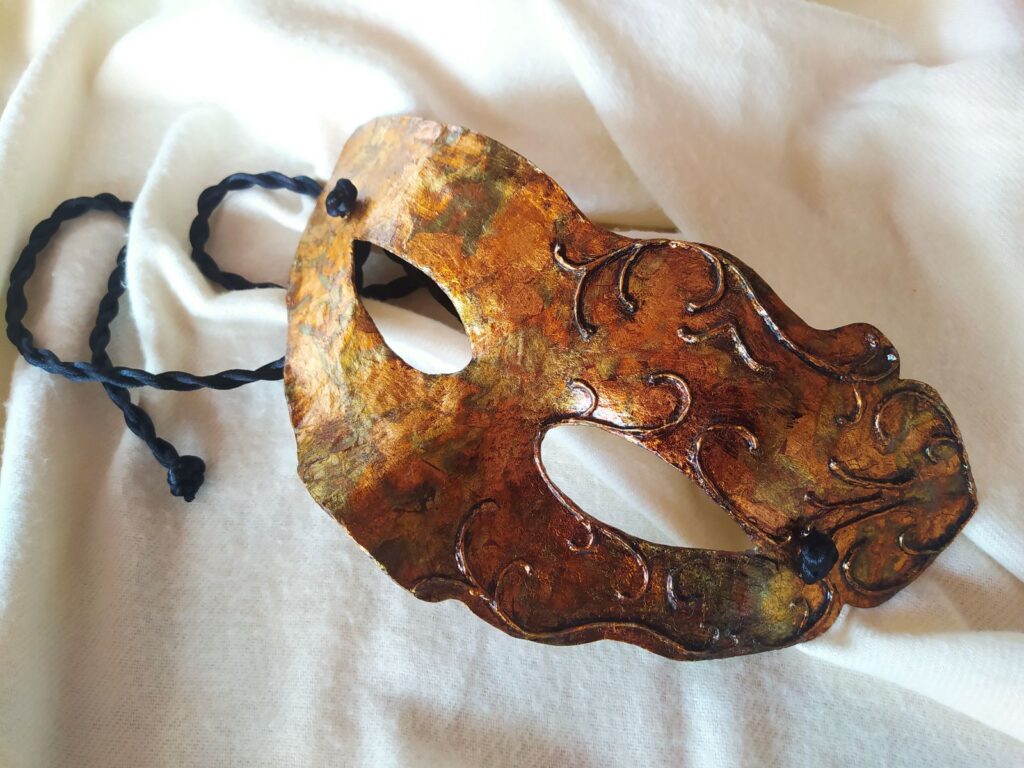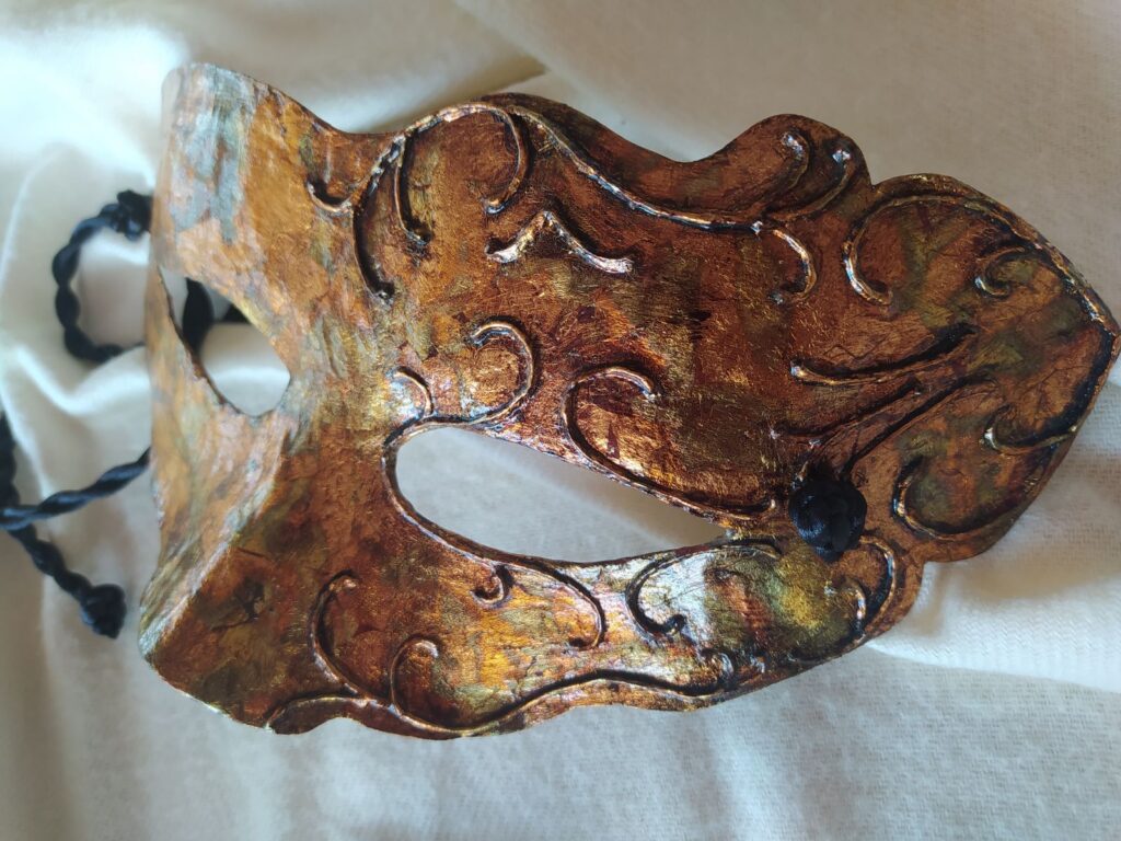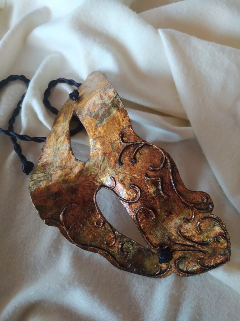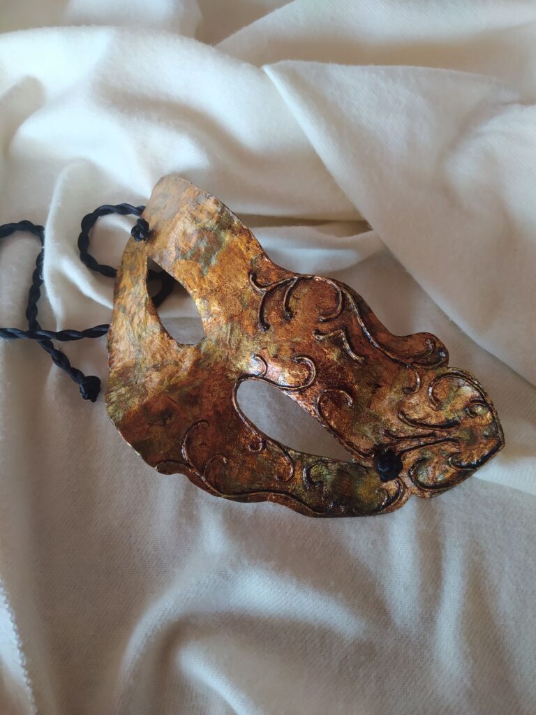 Antifaz único realizado de cartapesta, que le aporta una textura ligera. Está decorado con delicados detalles en pasta de relieve, que añaden un toque tridimensional.. Su revestimiento de pan de oro irisado tiene matices que cambian según la luz, añadiendo un aire de sofisticación y misterio. El efecto envejecido le da un carácter vintage, como si llevara consigo historias pasadas. Por último, su acabado en barniz satinado, no solo resalta su belleza, sino que también proporciona una suave protección, haciendo que este antifaz sea tanto una obra de arte como un accesorio magnífico.