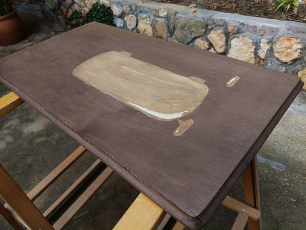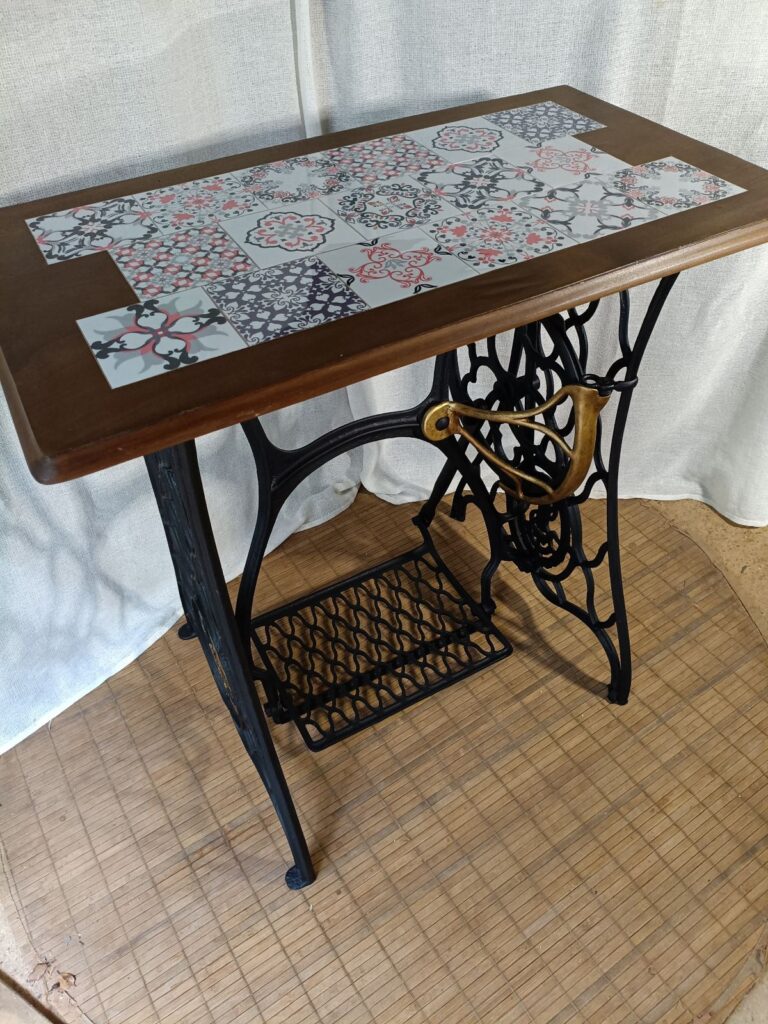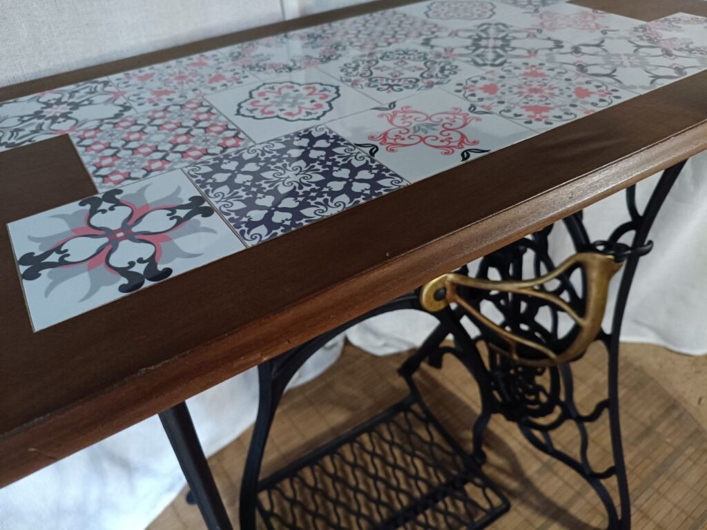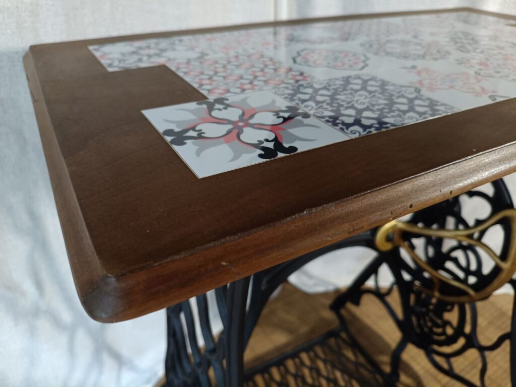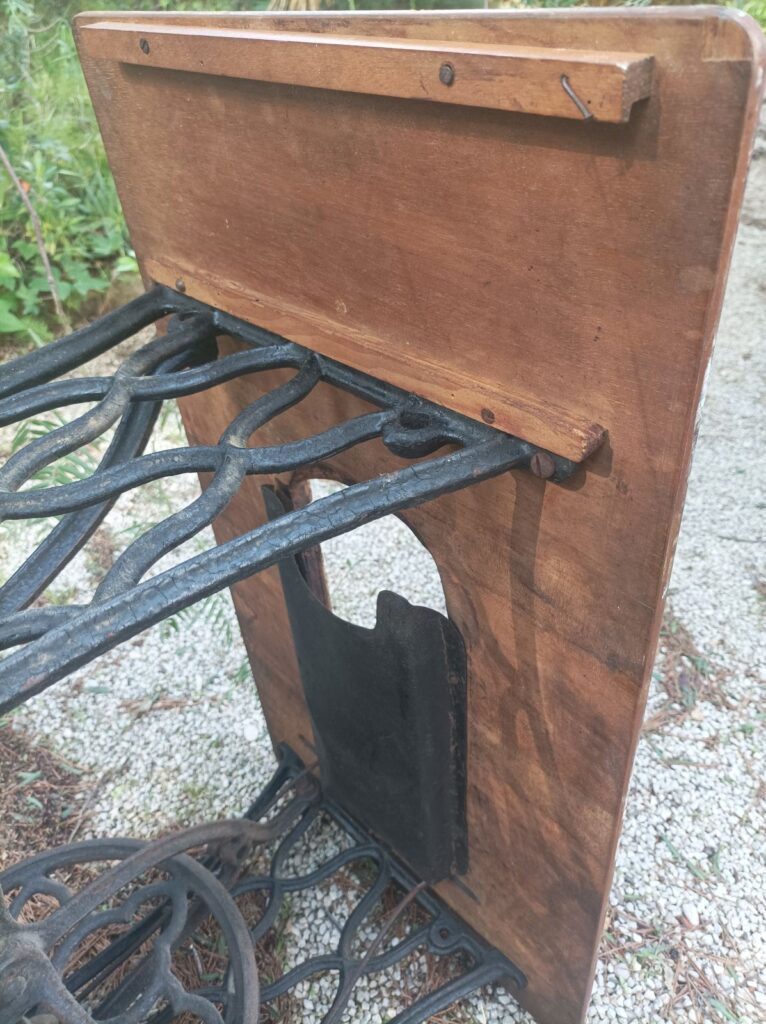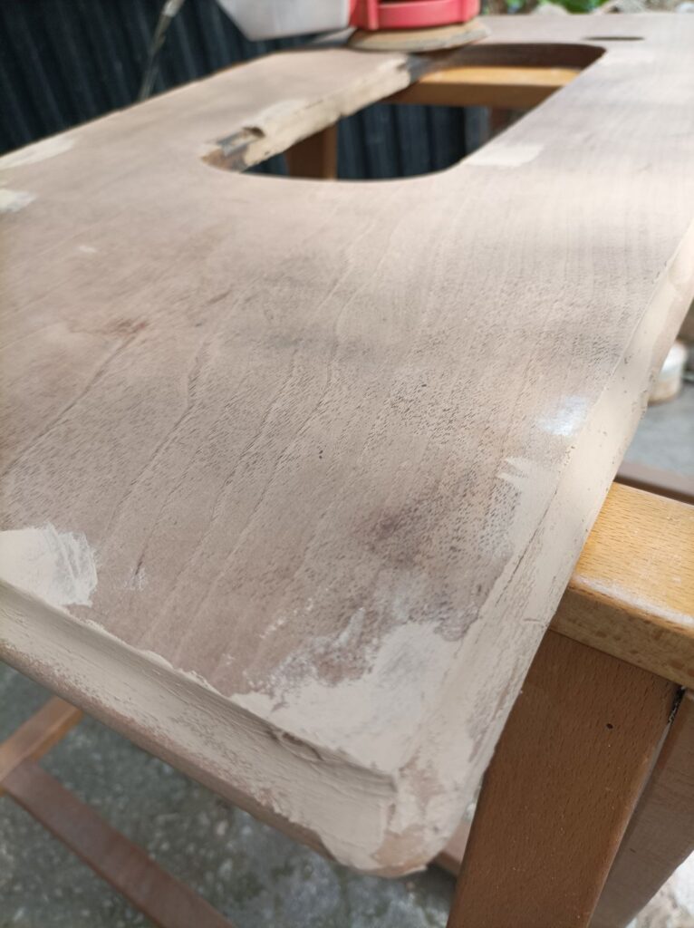 Comenzamos separando el pie metálico para trabajar con comodidad. Eliminamos rastros del antiguo cajón, lijamos a fondo y reparamos cada detalle. ¿El mayor reto? Tapar con precisión el hueco de la antigua máquina para lograr una superficie lisa y uniforme.