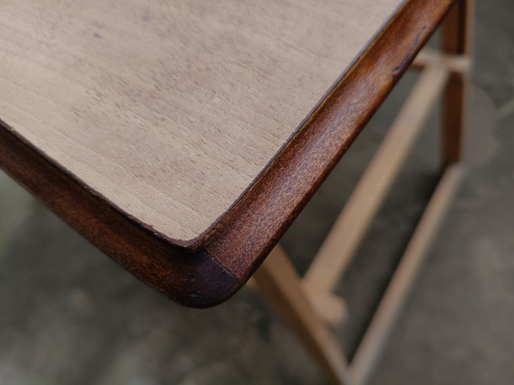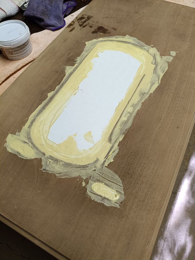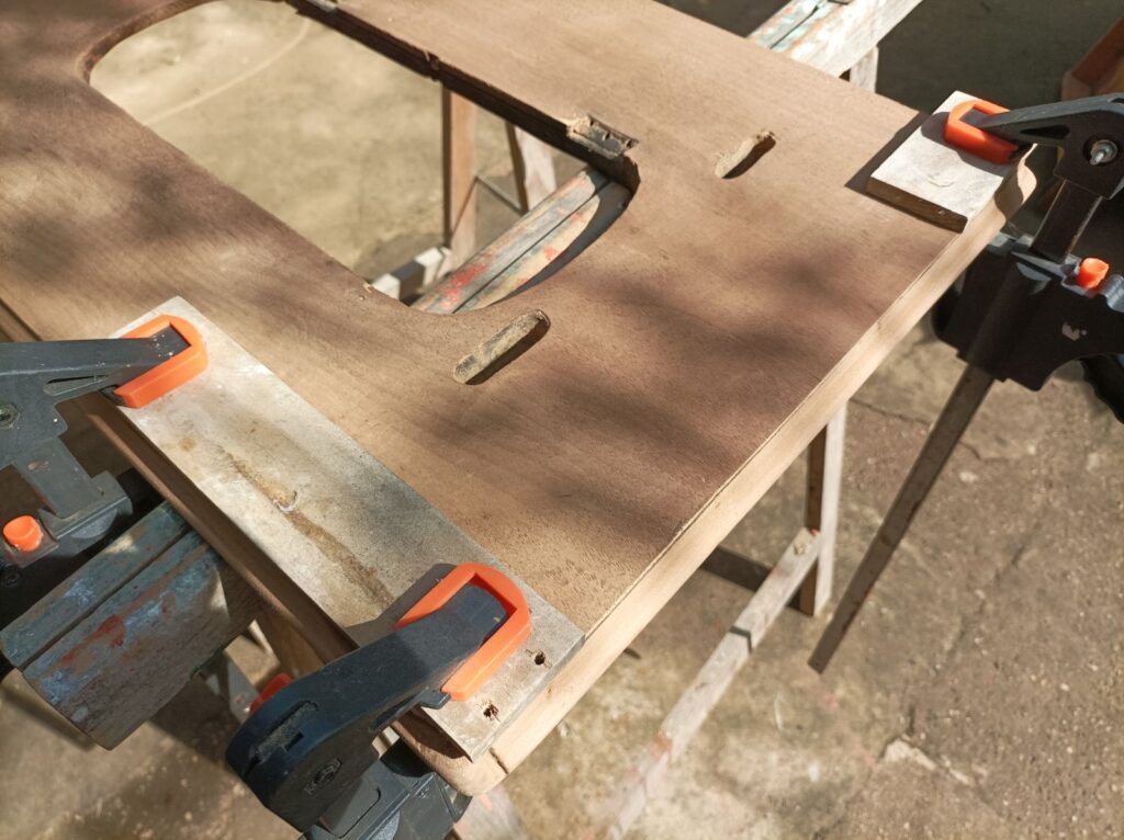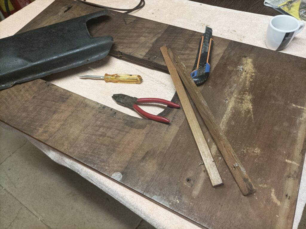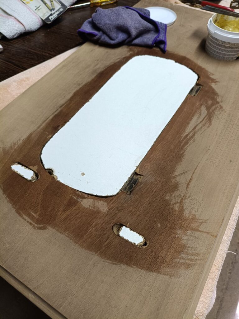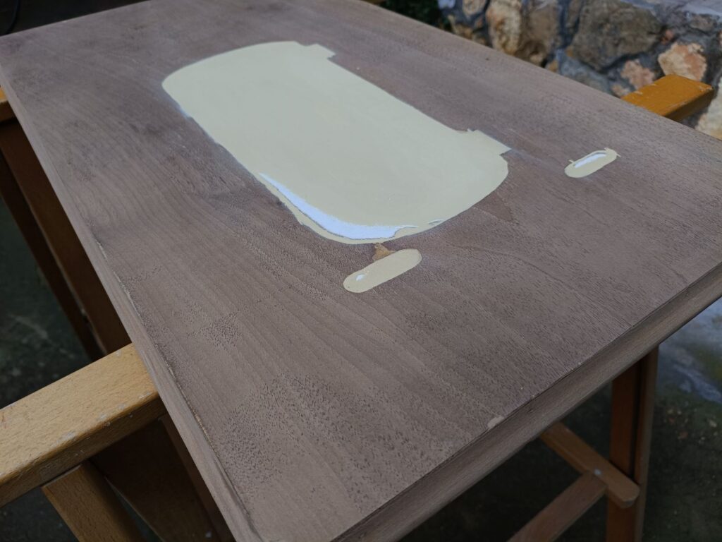 Comenzamos separando el pie metálico para trabajar con comodidad. Eliminamos rastros del antiguo cajón, lijamos a fondo y reparamos cada detalle. ¿El mayor reto? Tapar con precisión el hueco de la antigua máquina para lograr una superficie lisa y uniforme.