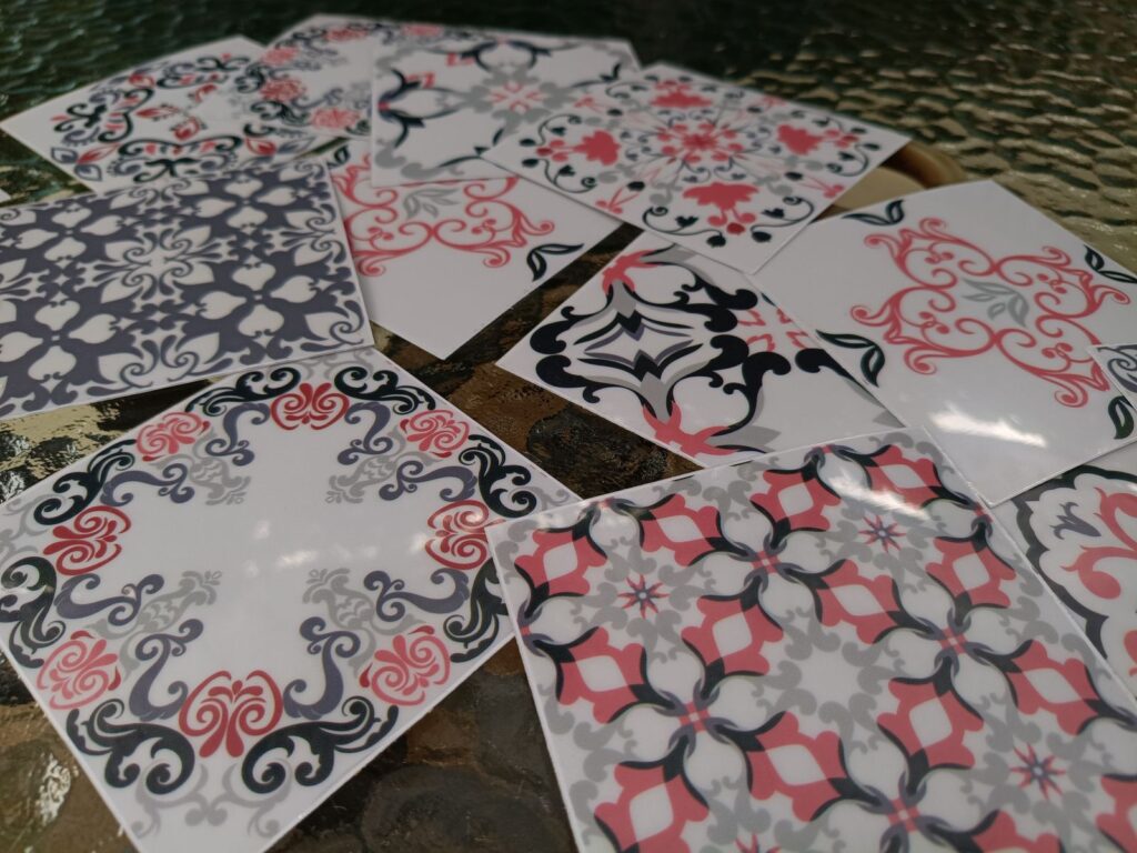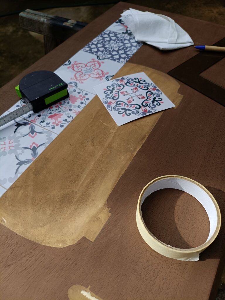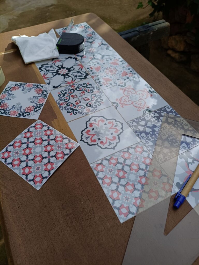 Transformamos la pieza mediante un tiente e integramos una cenefa de PVC imitando azulejo hidráulico para cubrir el antiguo hueco.