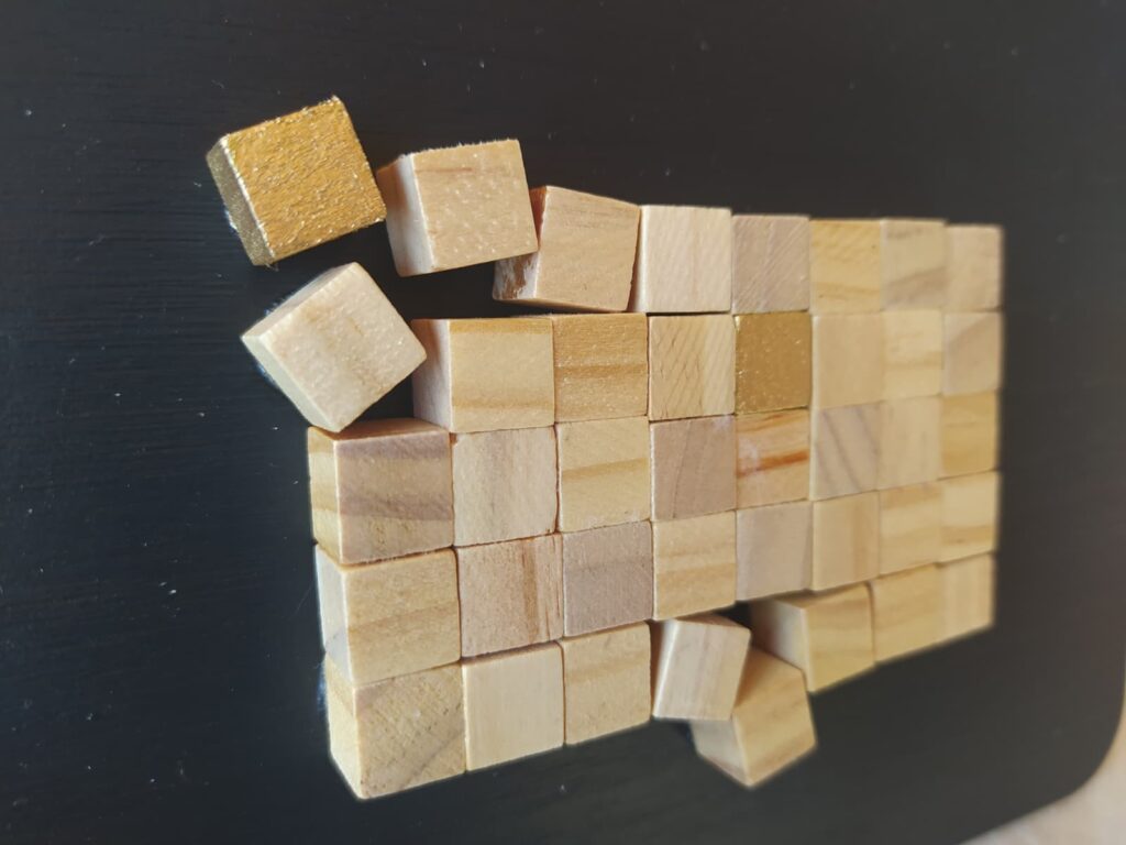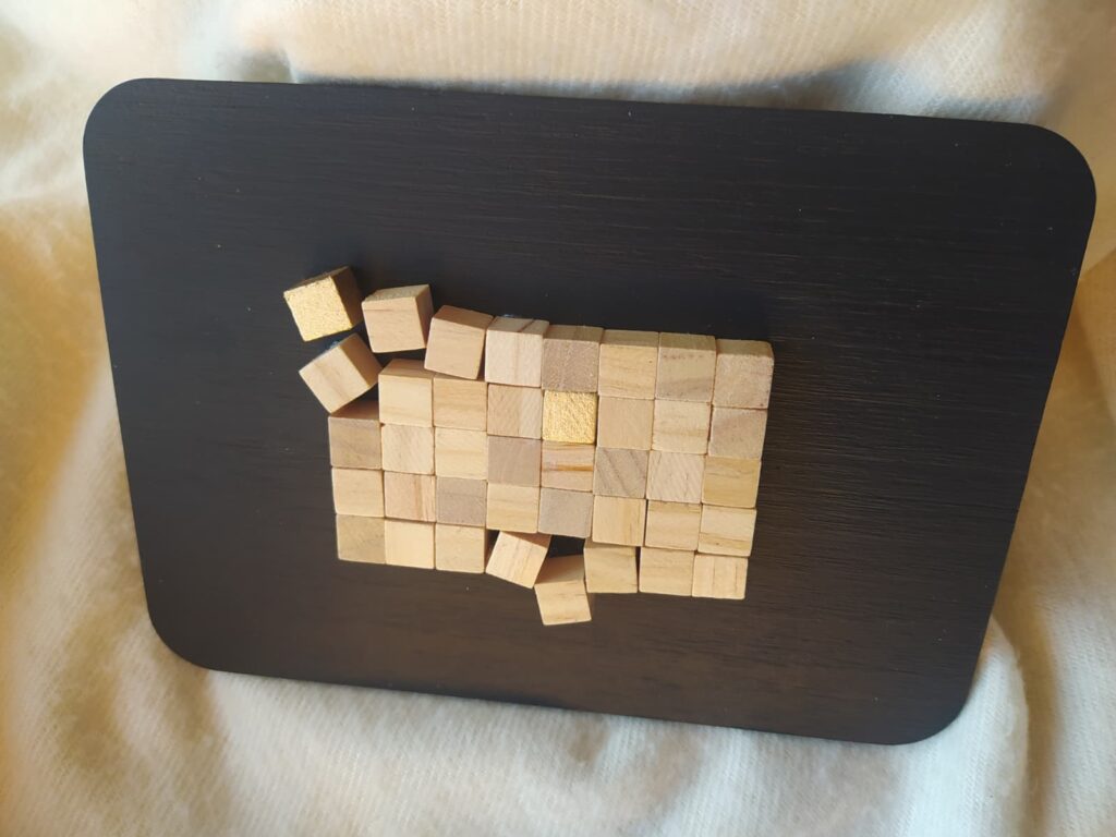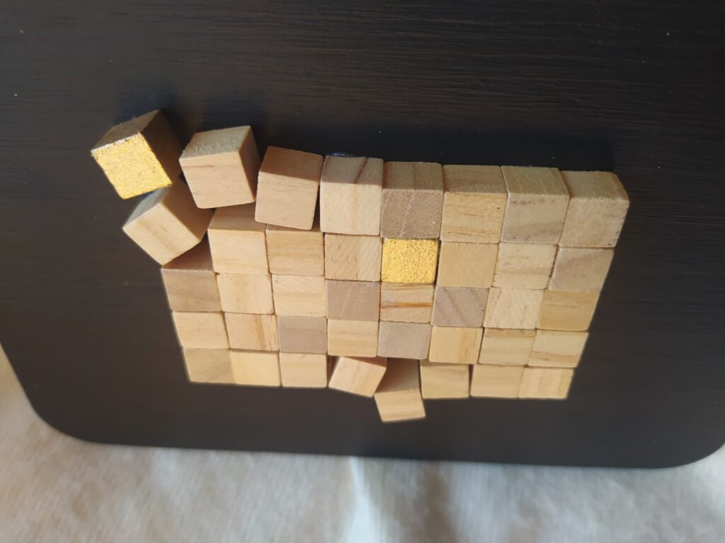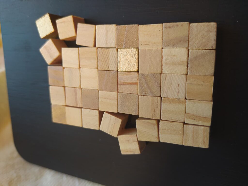 Cuadro formado por una composición de pequeños cubos de madera dispuestos sobre una tabla de DM pintada con acrílicos, creando una pieza con relieve, textura y un atractivo juego visual.