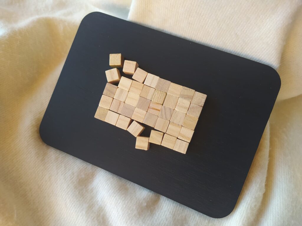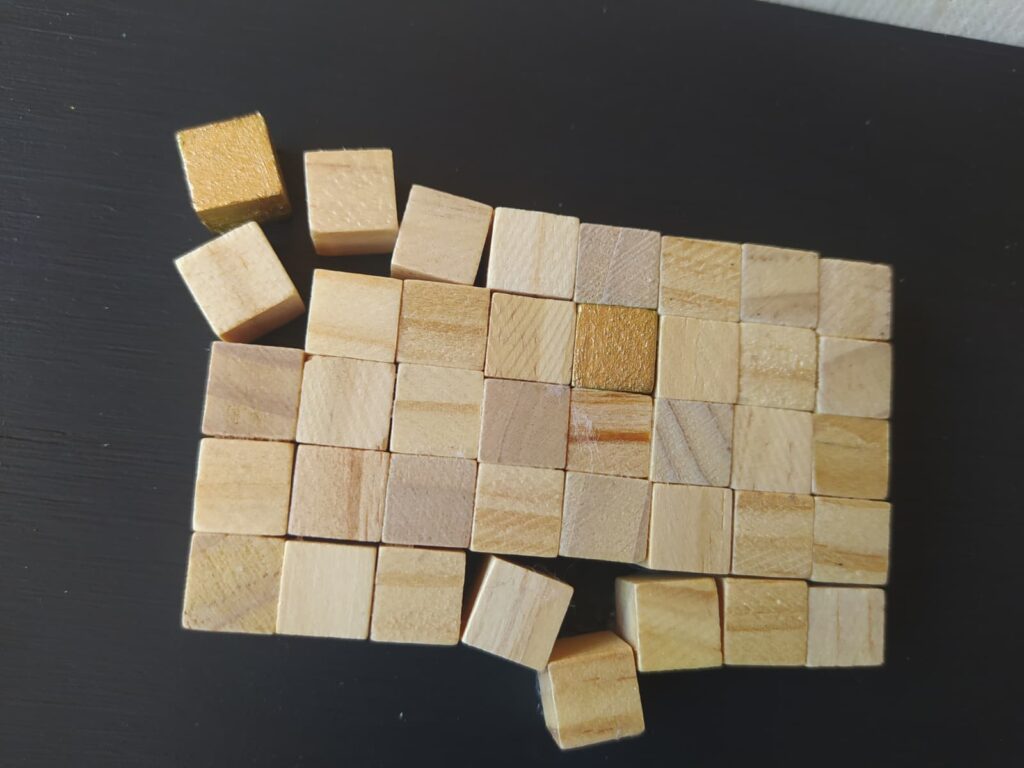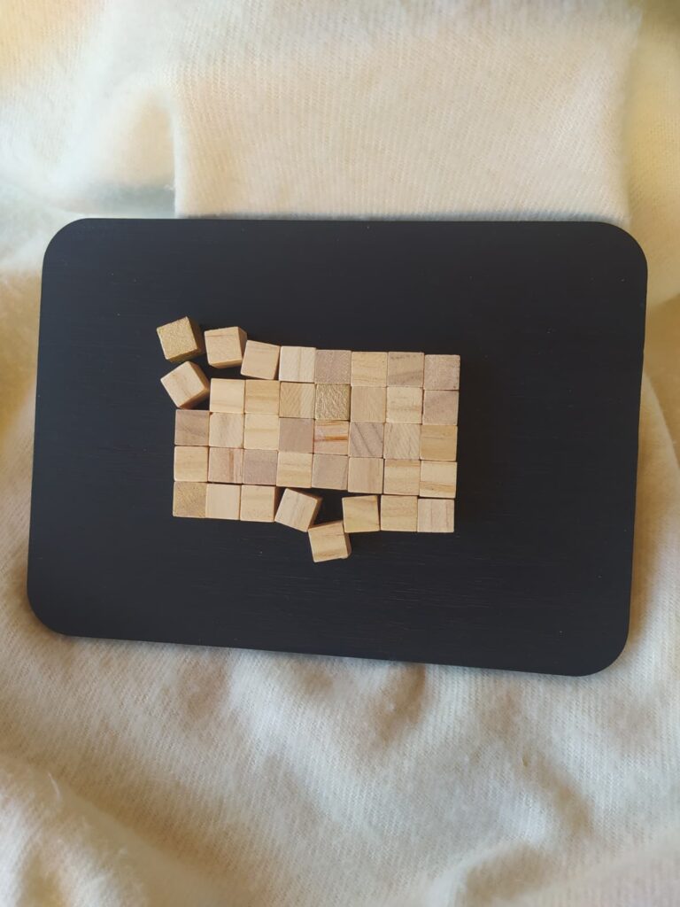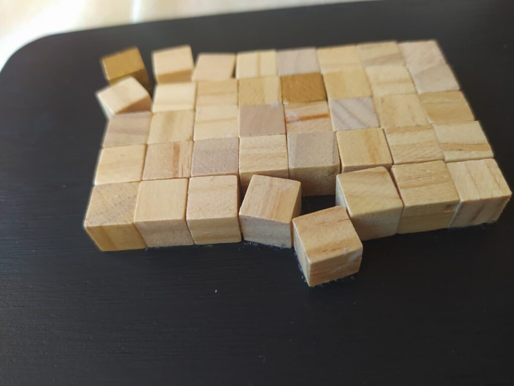 Cuadro formado por una composición de pequeños cubos de madera dispuestos sobre una tabla de DM pintada con acrílicos, creando una pieza con relieve, textura y un atractivo juego visual.