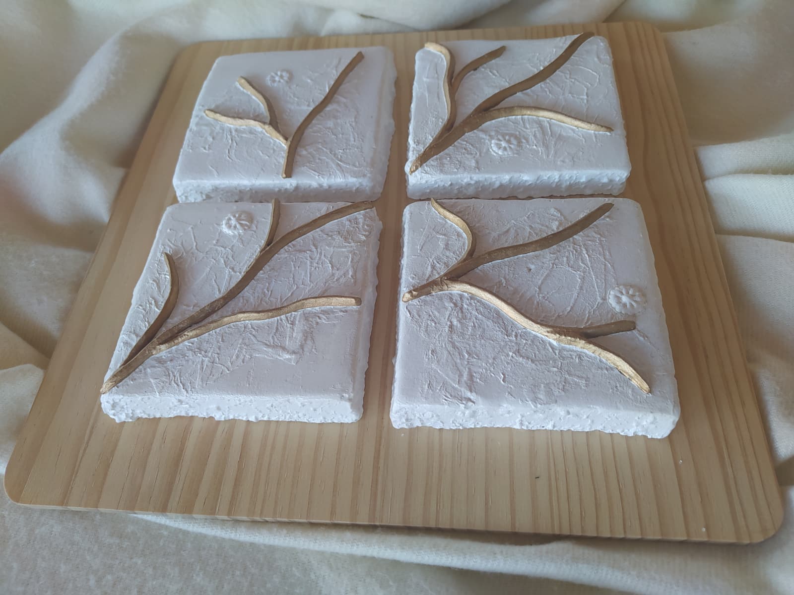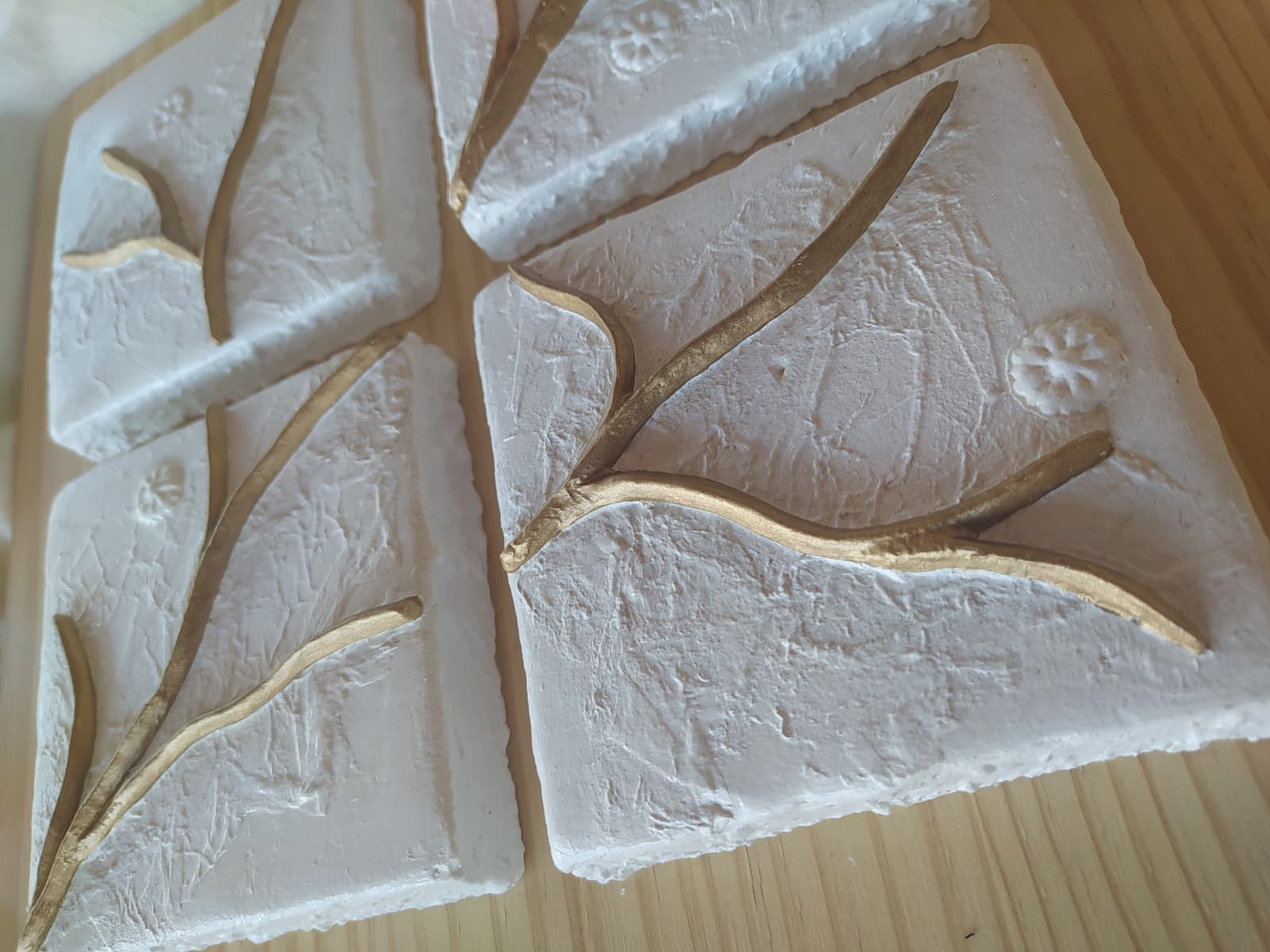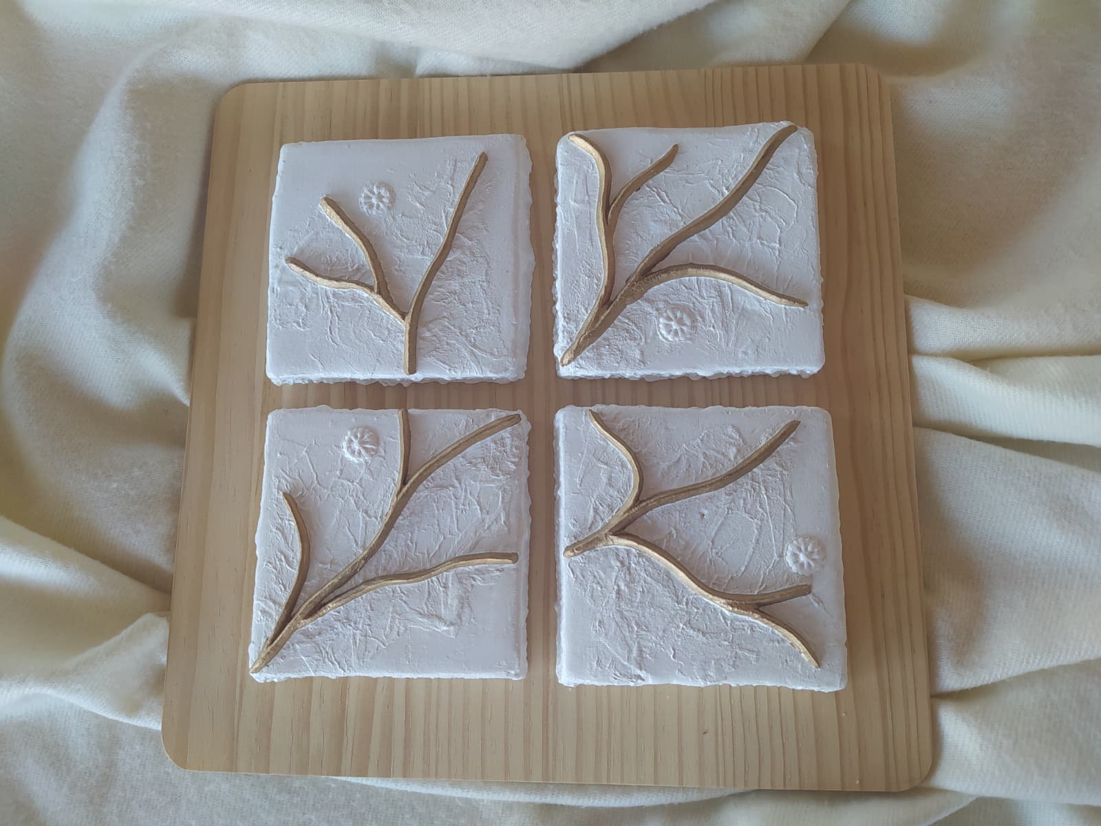 Composición de formas de pasta de modelado en frio sobre cuatro moldes de escayola.