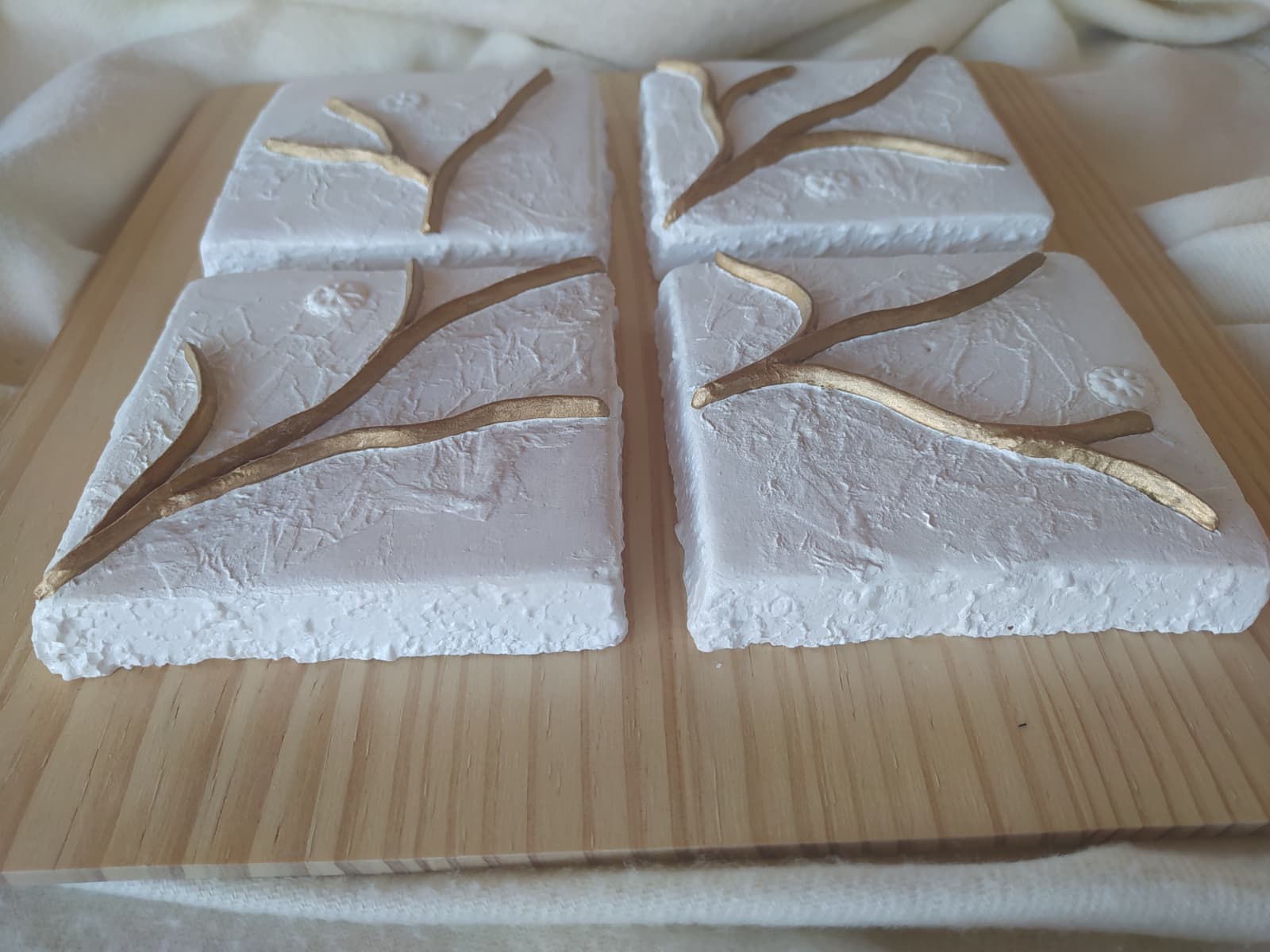 Tabla de madera decorada con decoupage y elementos superpuestos realizados con pasta de modelado.