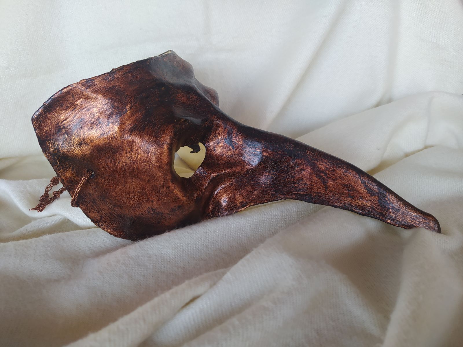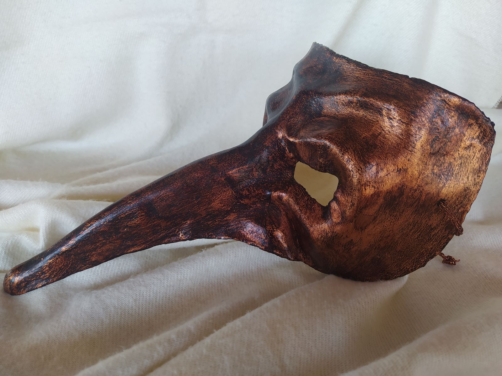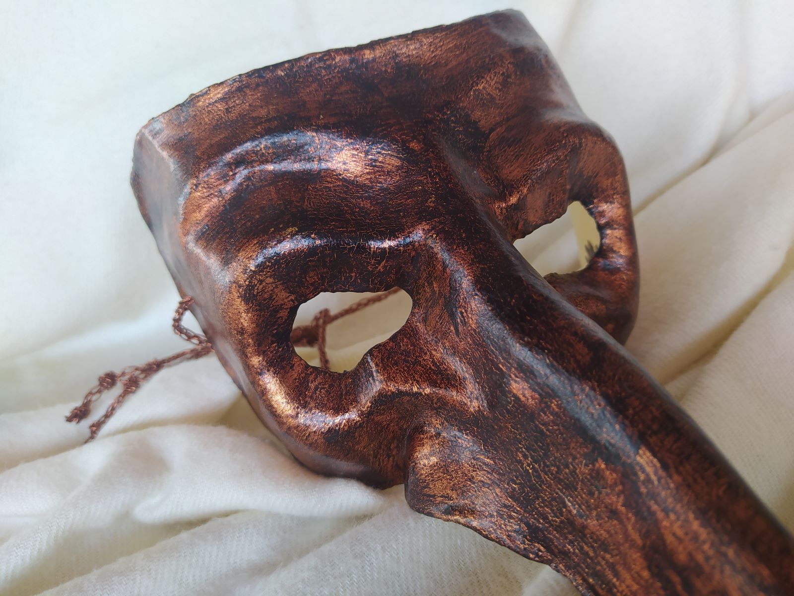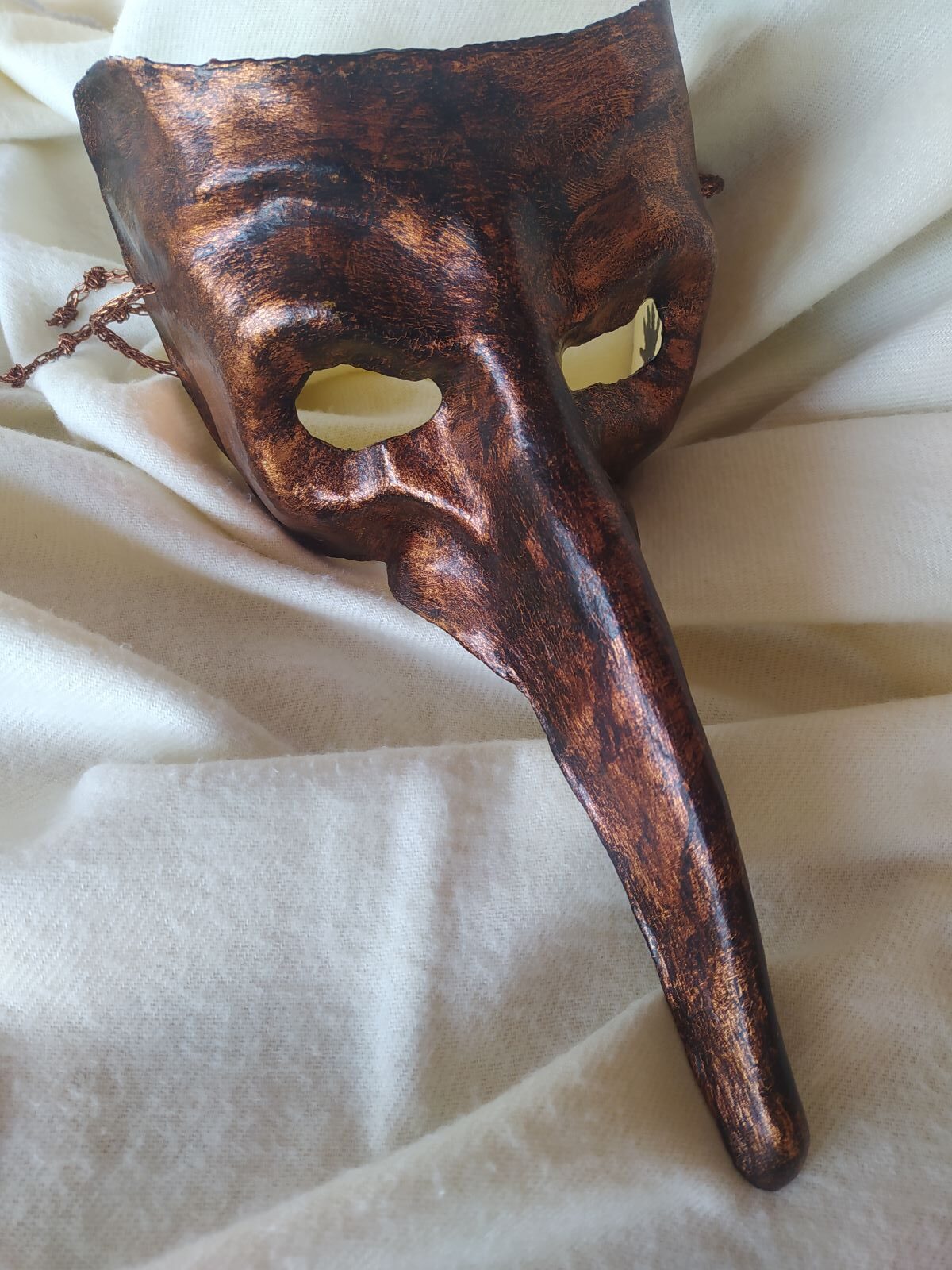 Máscara artesanal de estilo veneciano con nariz larga realizada en cartapesta,, recubierta de pan de oro envejecido y codón decorativo a juego.