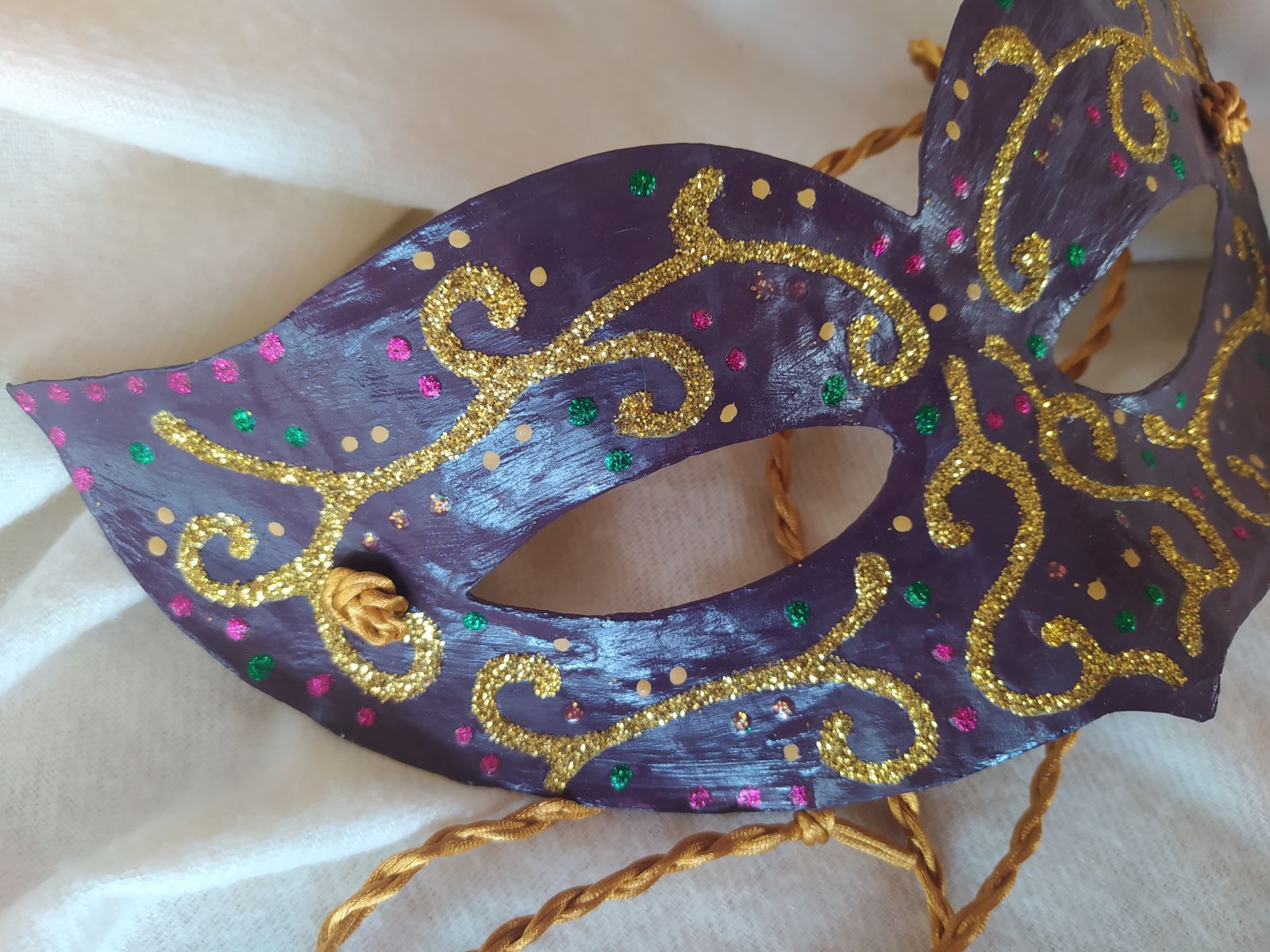 Antifaz artesanal de Cartapesta decorado con glitter glue de diferentes colores.