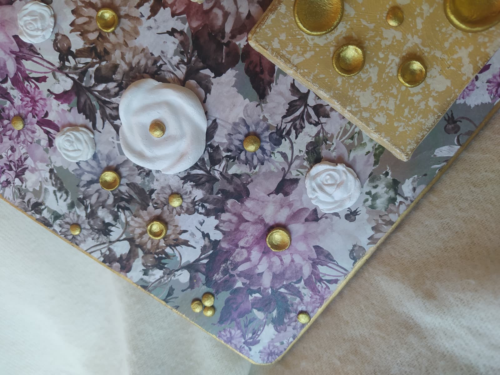 Mini lienzos pintados con acrilicos, sobre tabla cuadrada de madera decorada con la técnica decoupage.