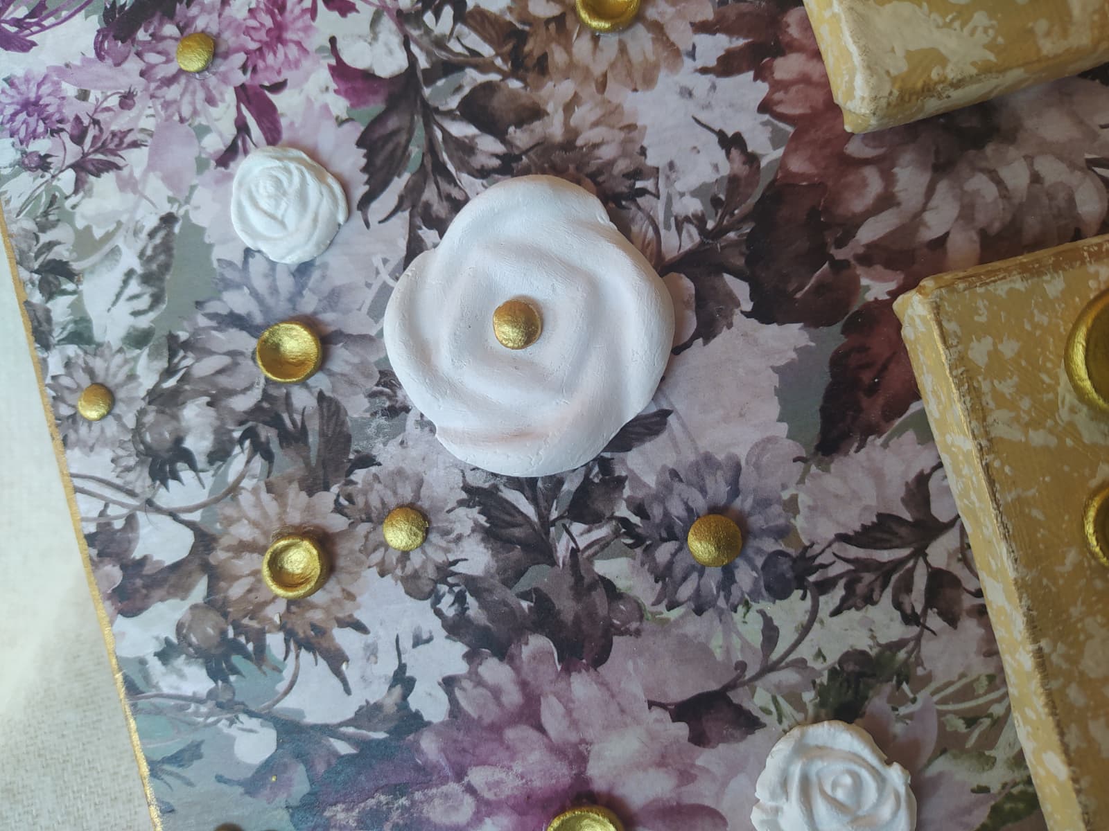 Mini lienzos pintados con acrilicos, sobre tabla cuadrada de madera decorada con la técnica decoupage. Pequeños elementos realizados con pasta de modelado en frio sobre lienzos y tabla.