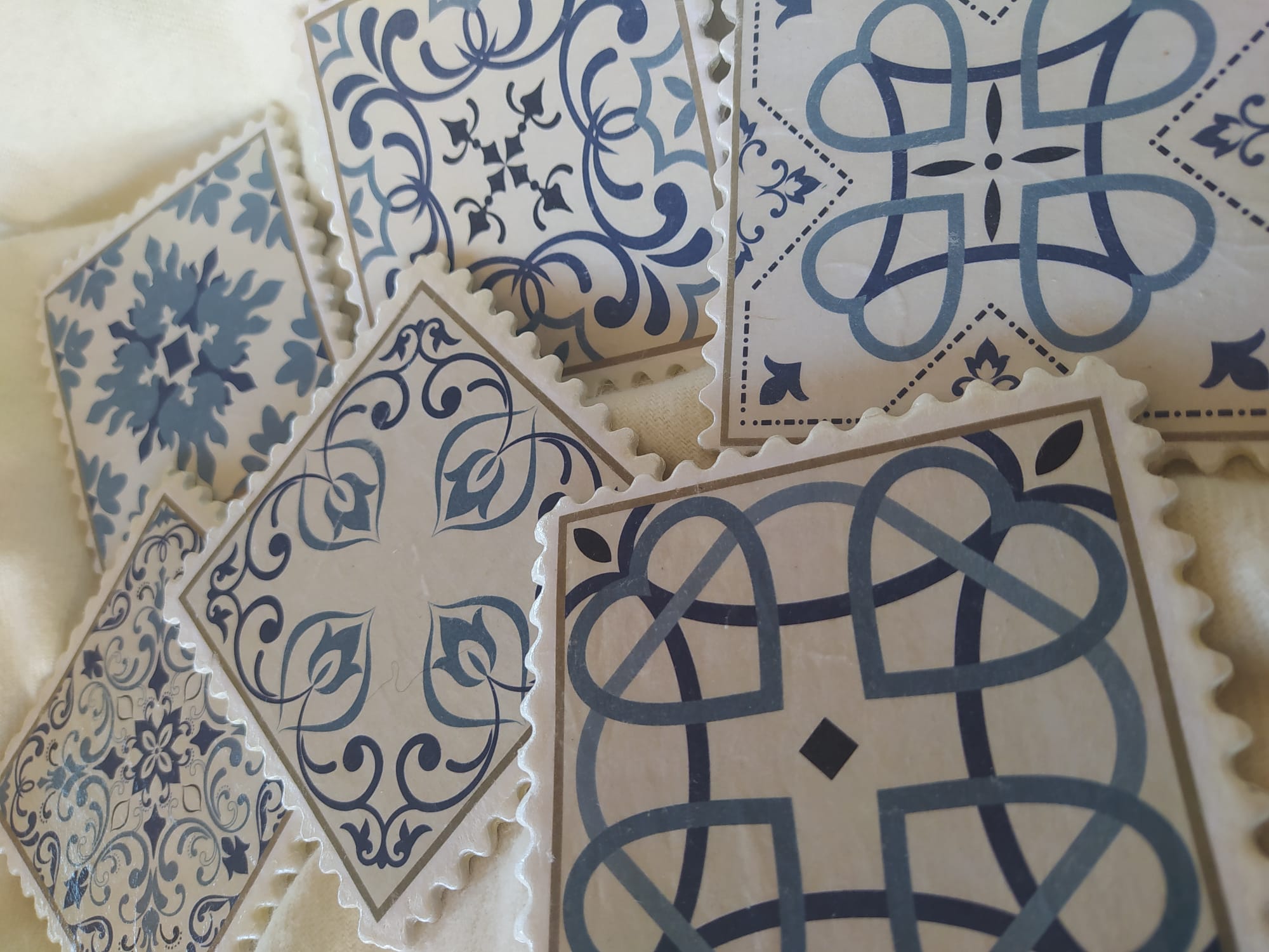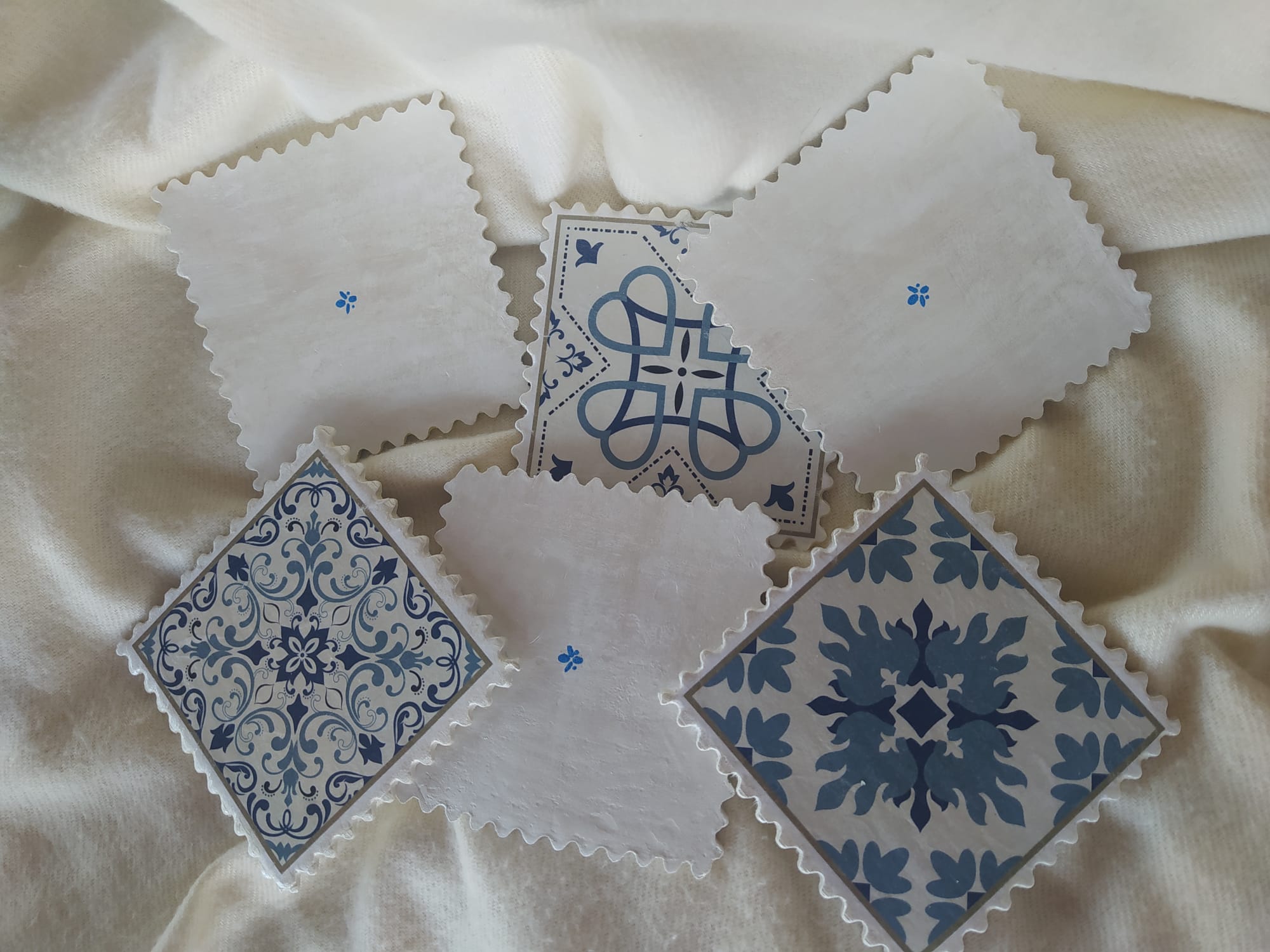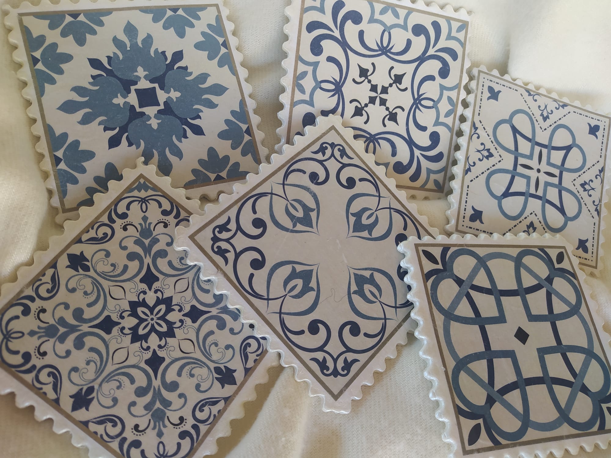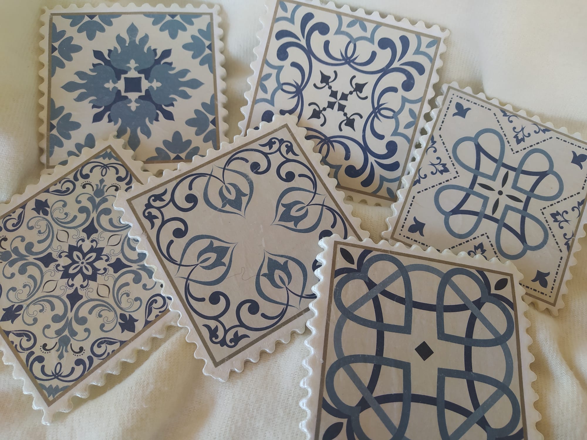 Conjunto de 6 posavasos con bordes desntados realizados con pasta de modelado en frio y decorados con la técnica de decoupage.