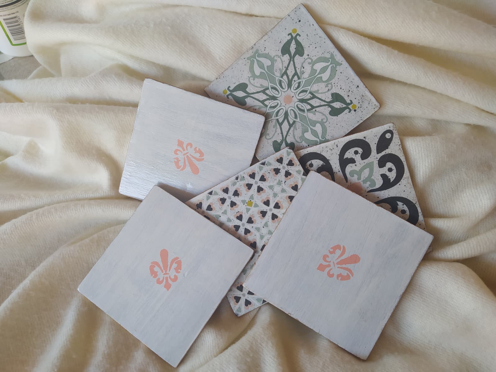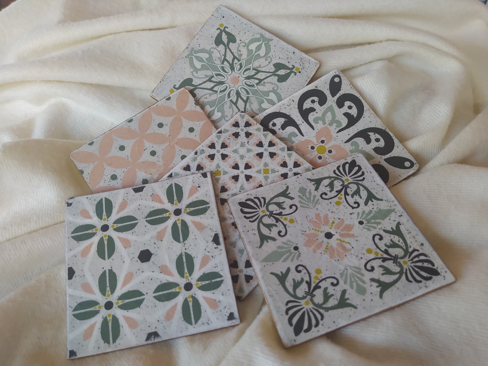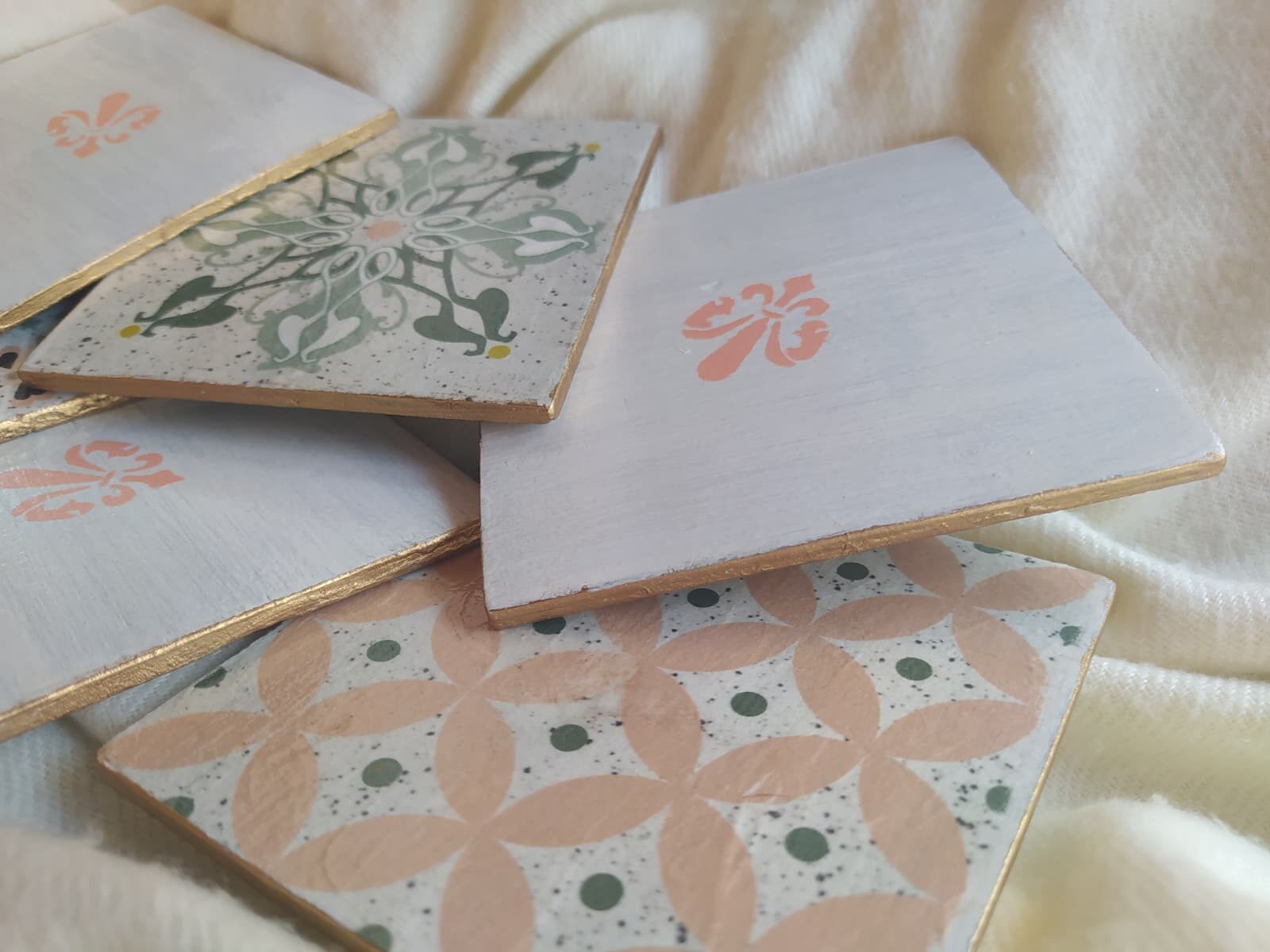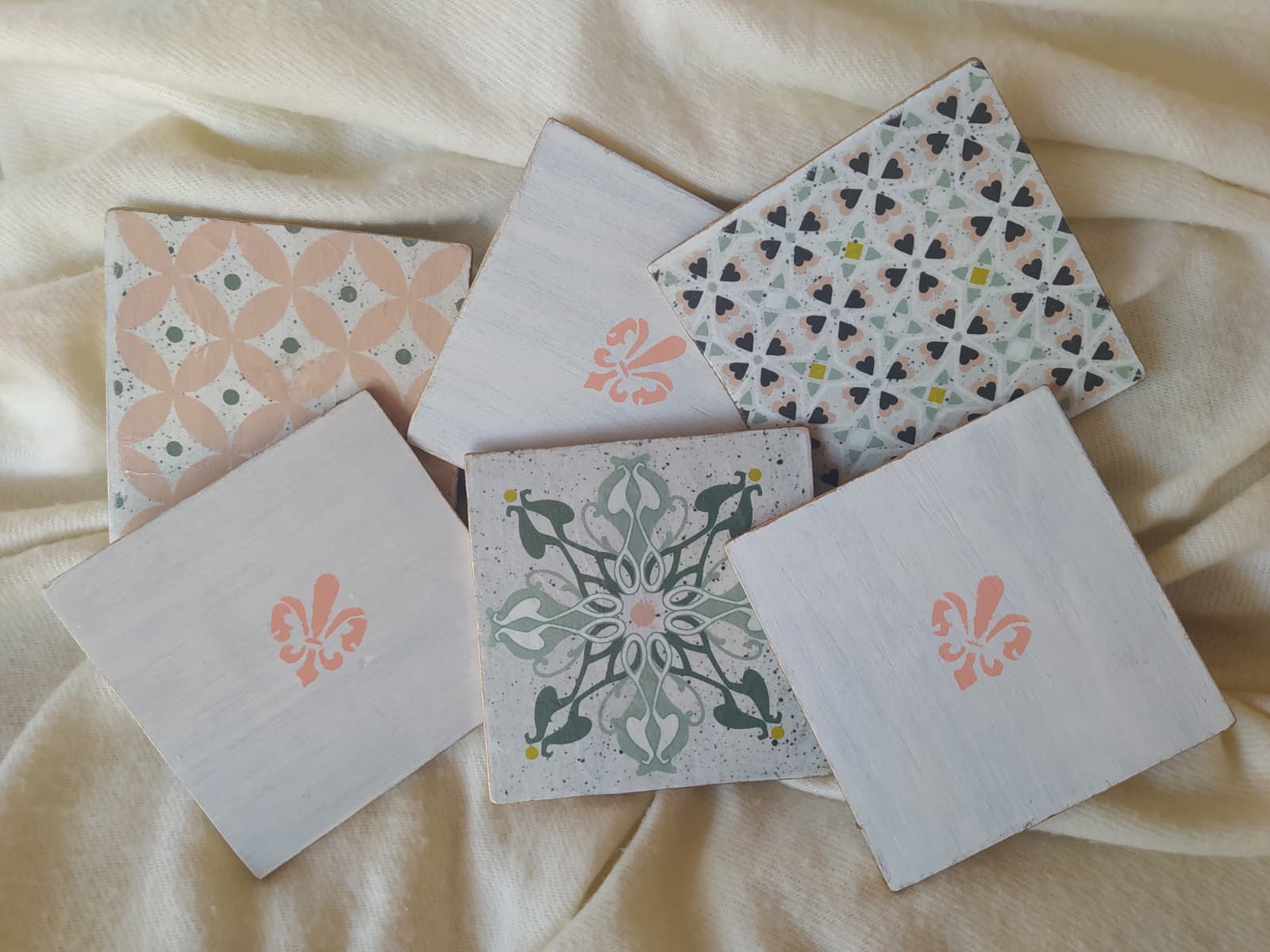 Conjunto de seis posavasos de madera de balsa decorados con la técnica de decoupage en el anverso y con un motivo con stencil en el reverso, bordeados con pátina dorada.
