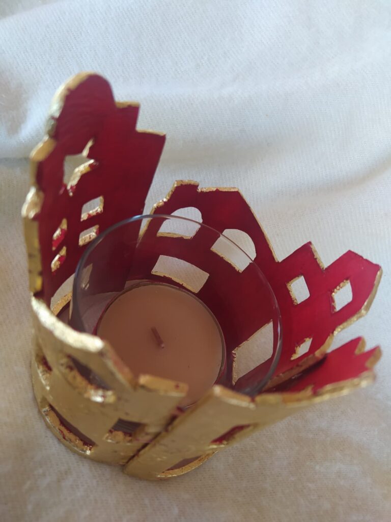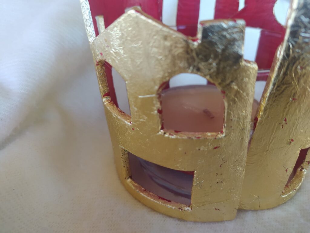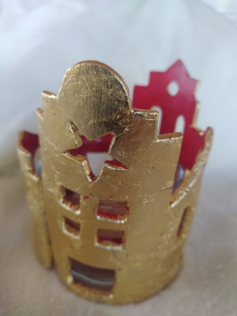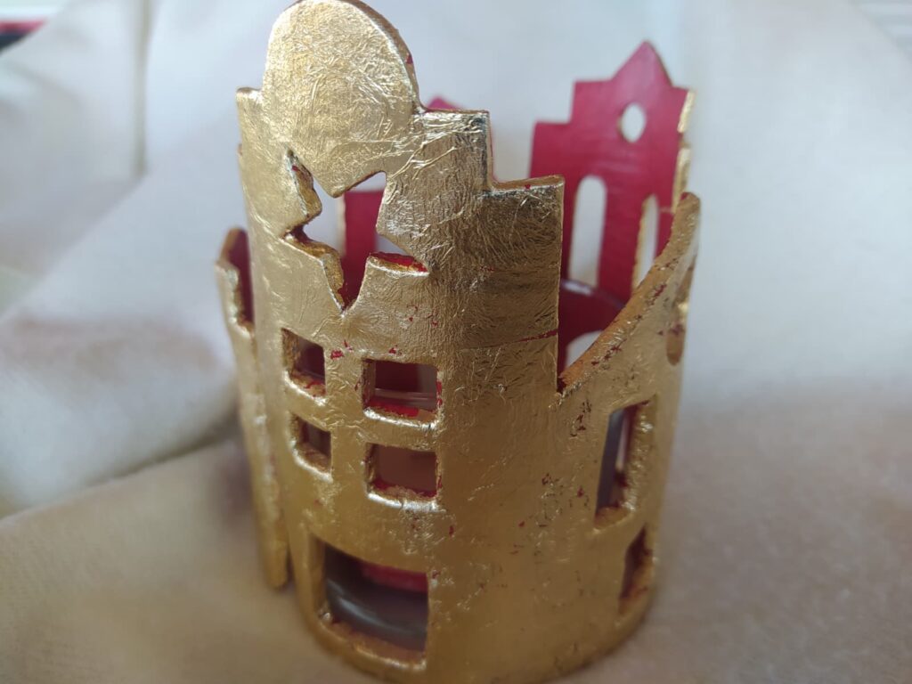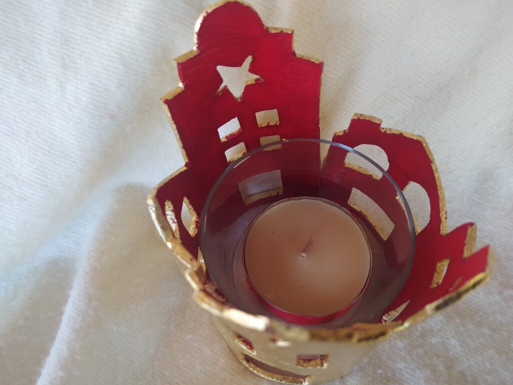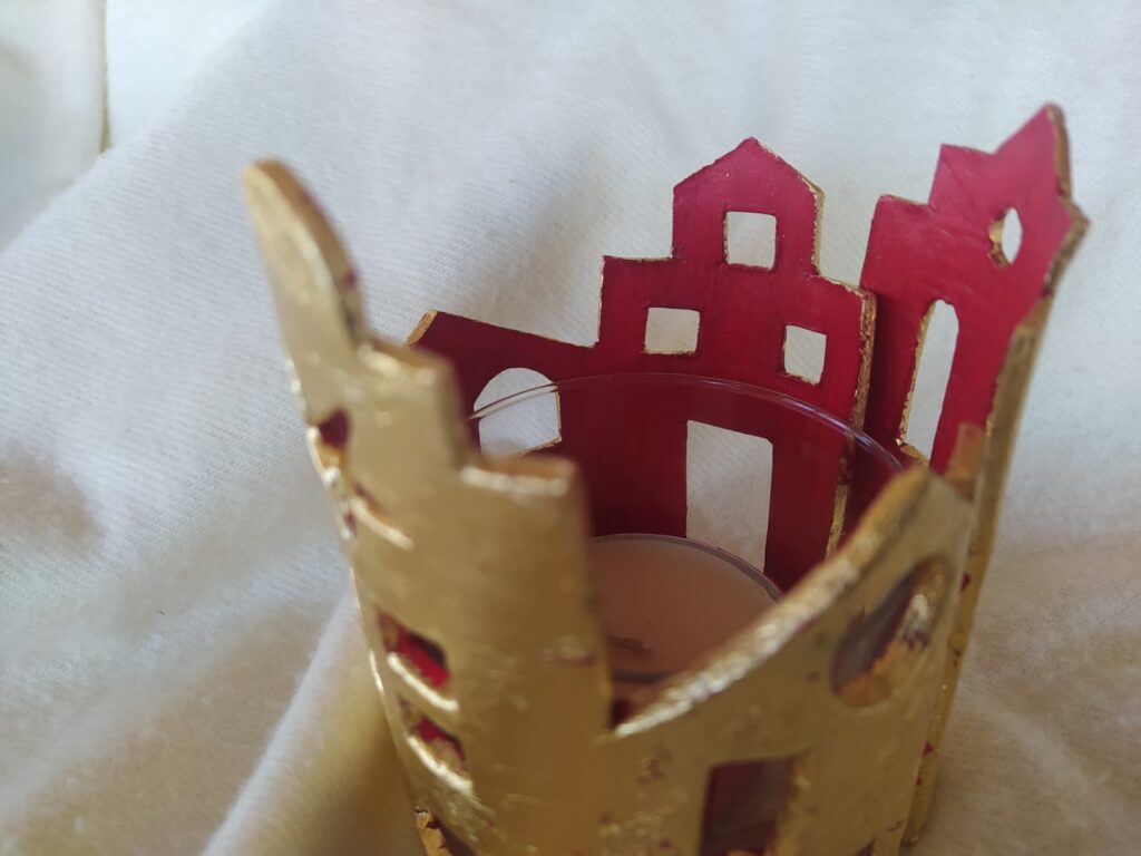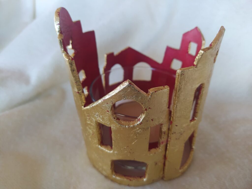 Vaso portavelas rodeado de delicadas casitas realizadas en pasta de modelado en frío, decoradas con pan de oro y acrílico rojo en su interior.