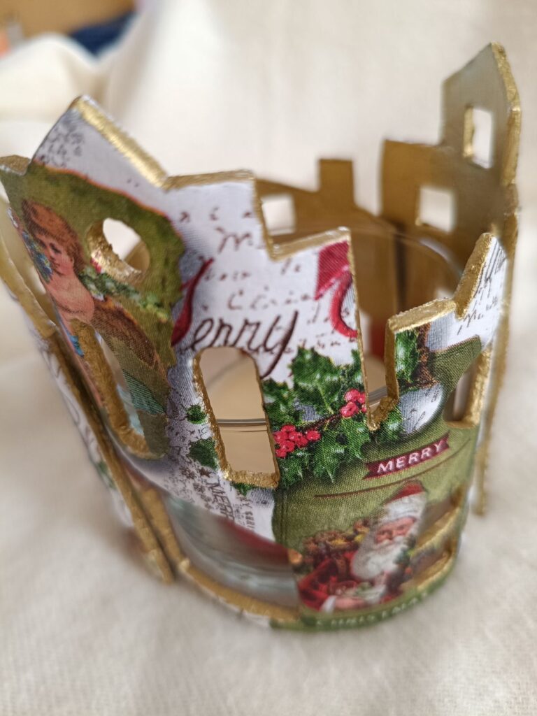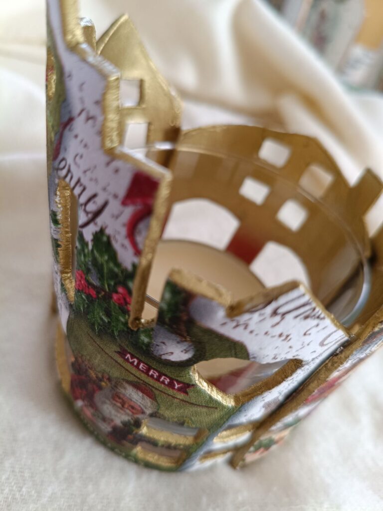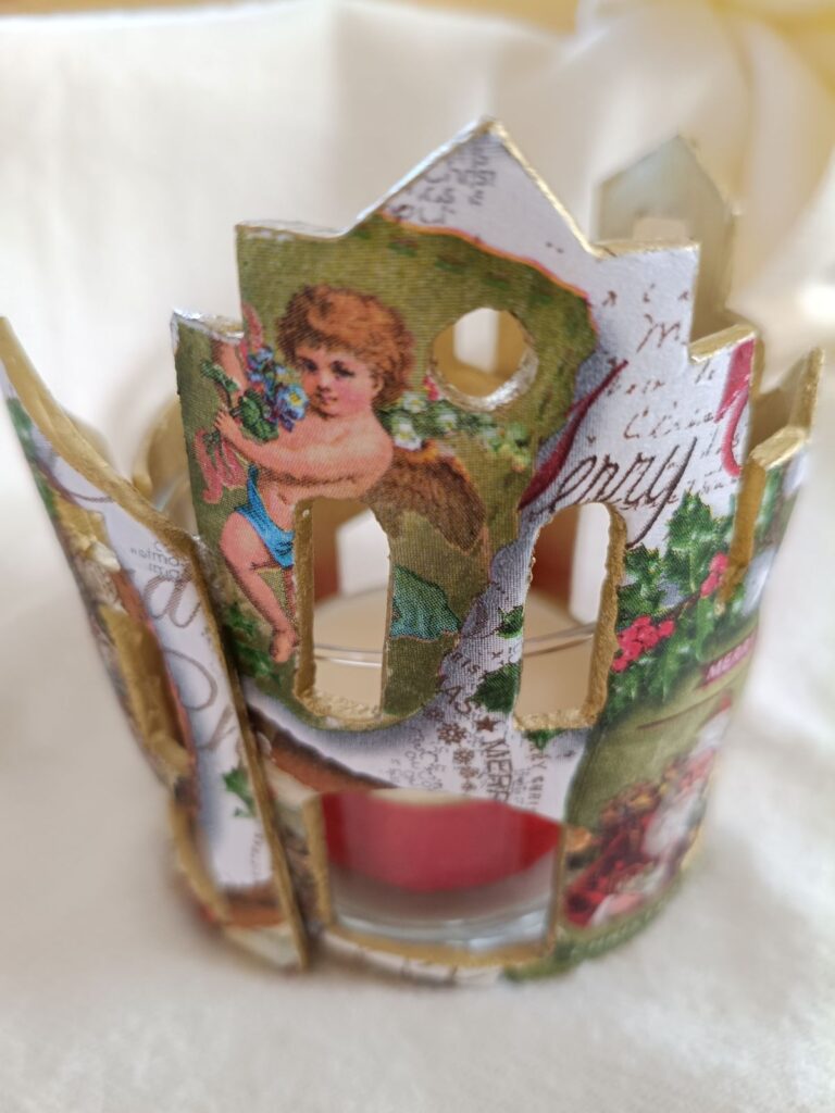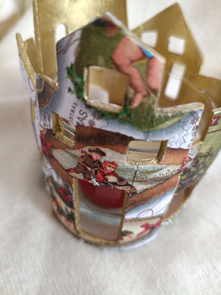 Vaso portavelas rodeado de delicadas casitas realizadas en pasta de modelado en frío, decoradas con técnica decoupage y detalles en oro rico en su interior.
