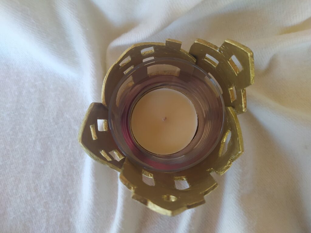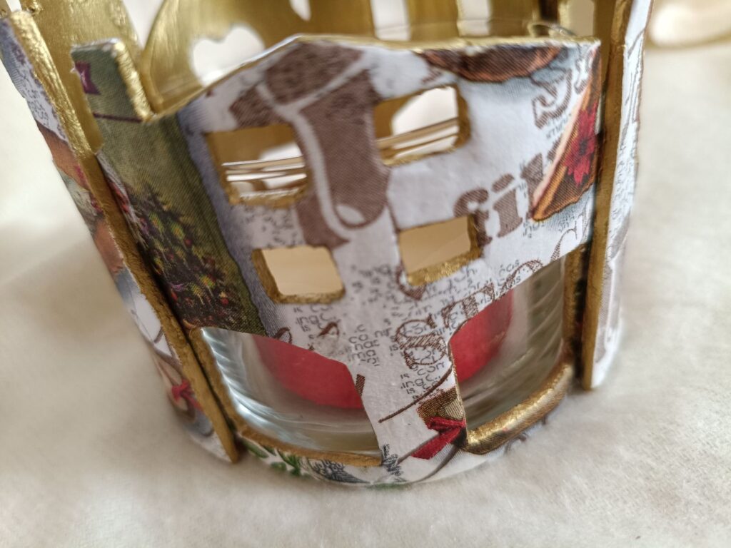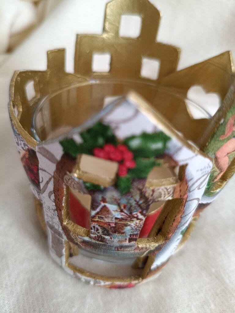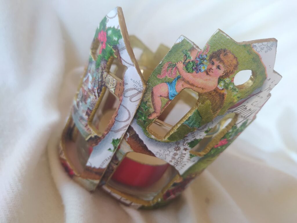 Vaso portavelas rodeado de delicadas casitas realizadas en pasta de modelado en frío, decoradas con técnica decoupage y detalles en oro rico en su interior.